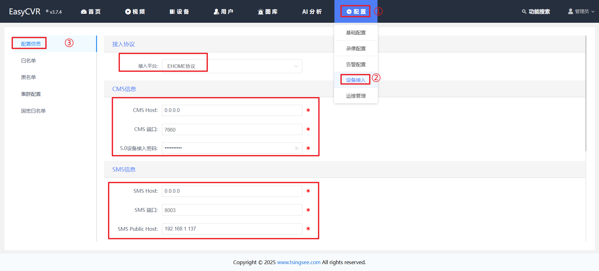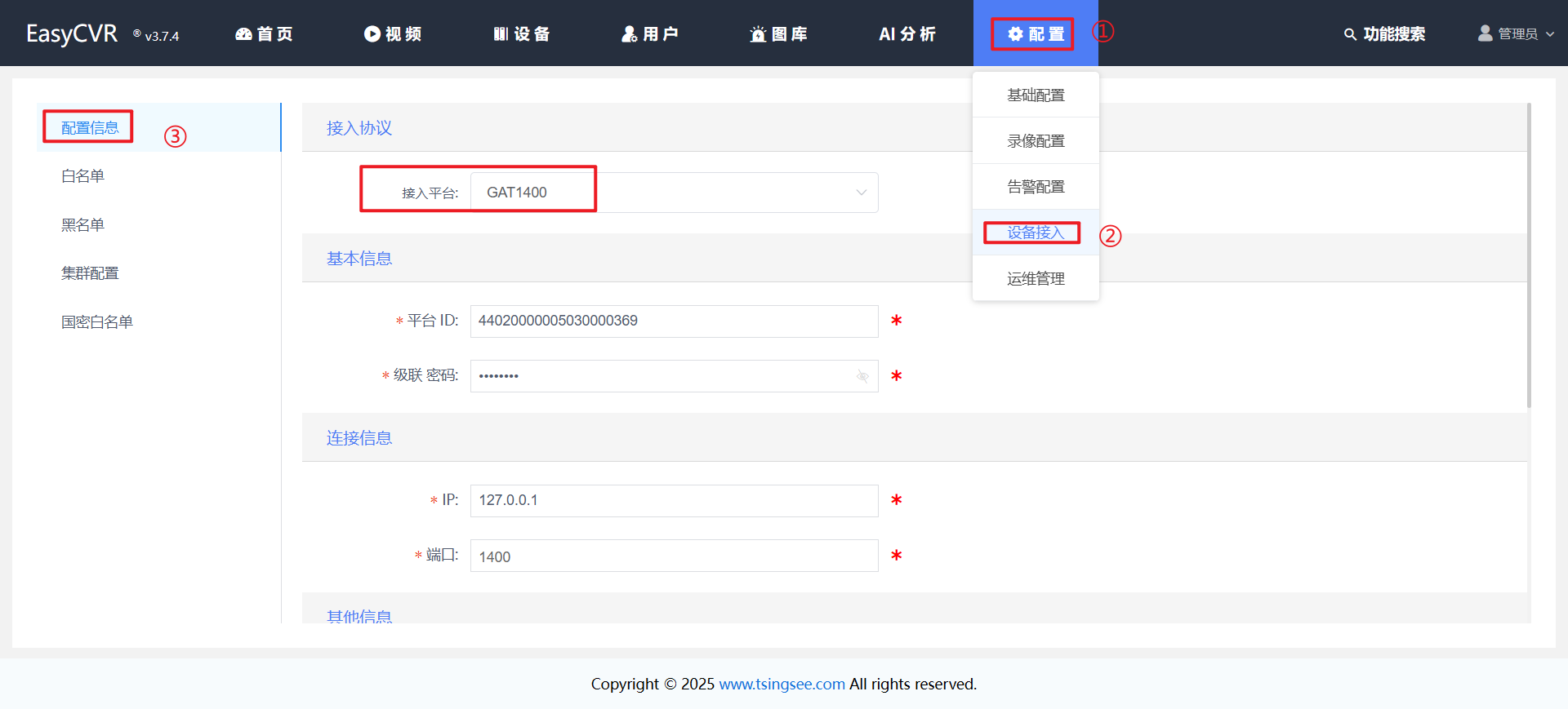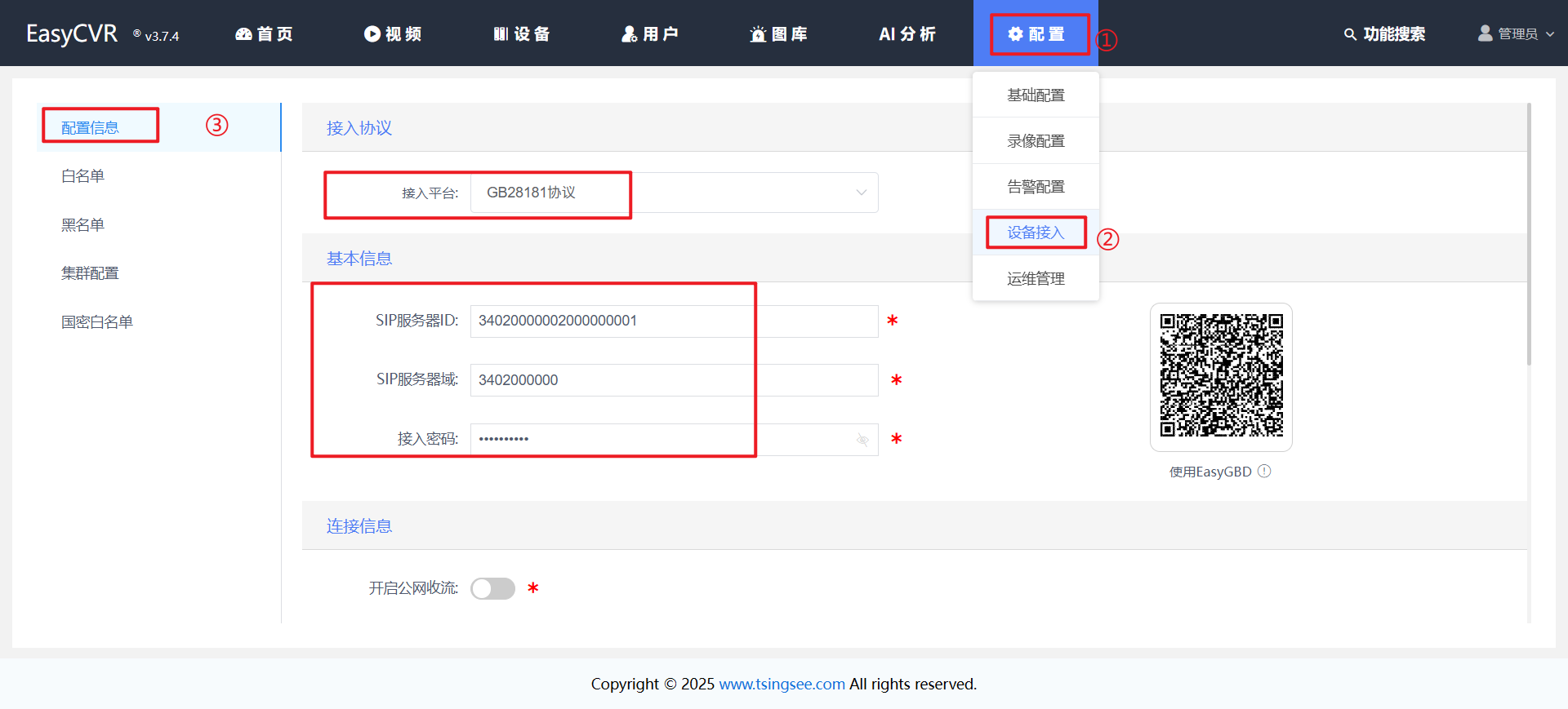 在上级 EasyCVR 平台【配置】-【设备接入】-【配置信息】中,选择接入平台为 GB28181 协议,底部有“一键复制”功能,点击后可一键复制级联配置信息。