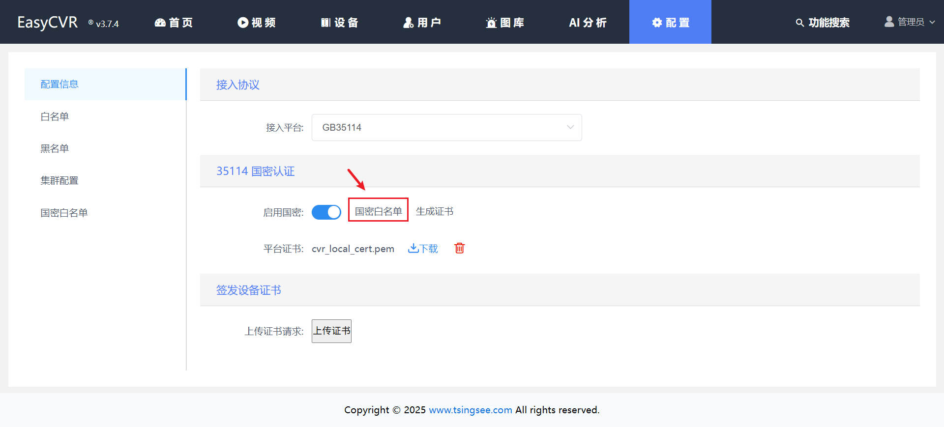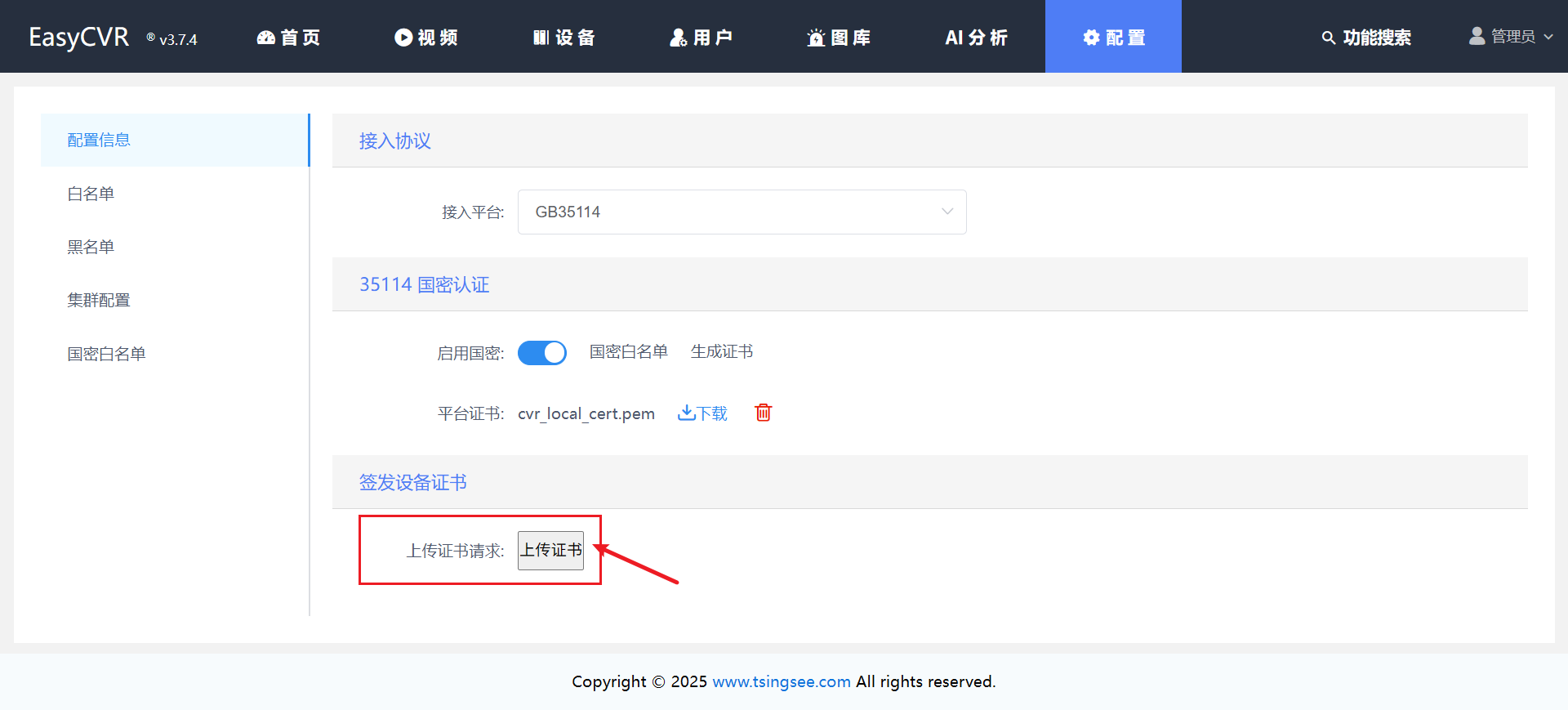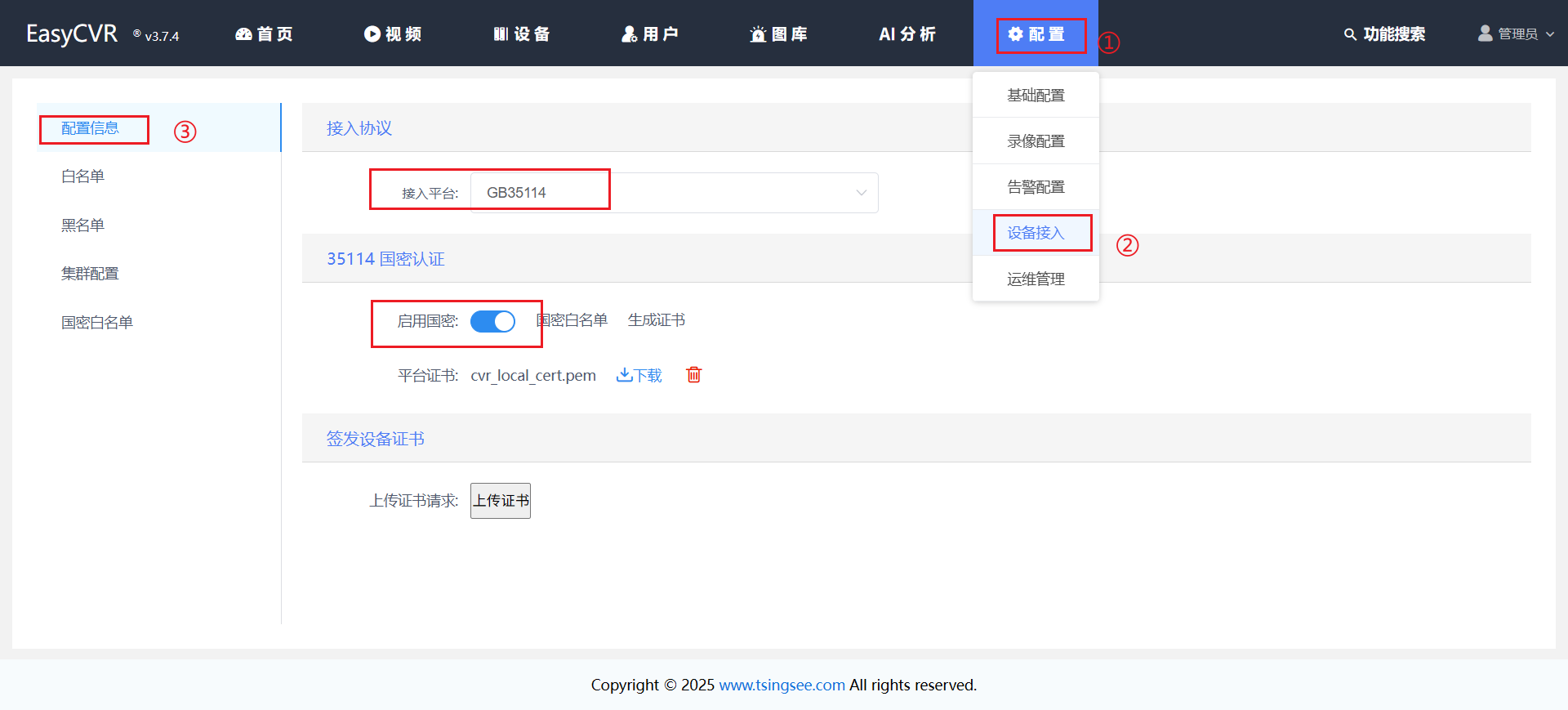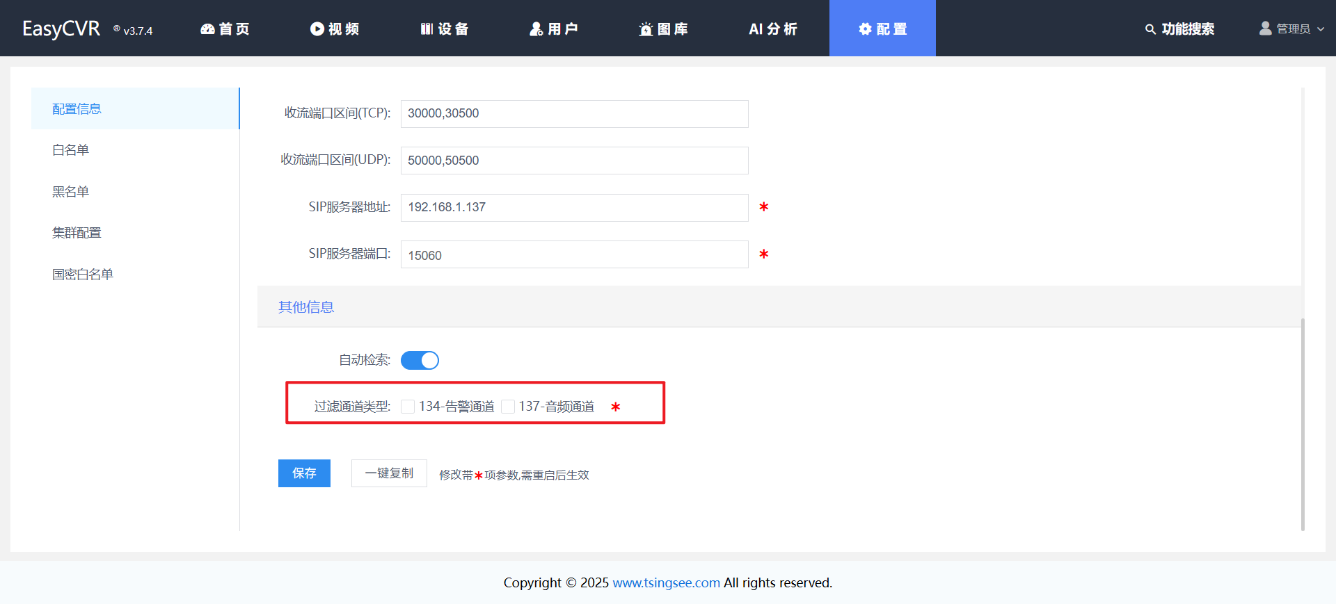 在上级 EasyCVR 平台【配置】-【设备接入】-【配置信息】中,选择接入平台为 GB28181 协议,底部有“一键复制”功能,点击后可一键复制级联配置信息。