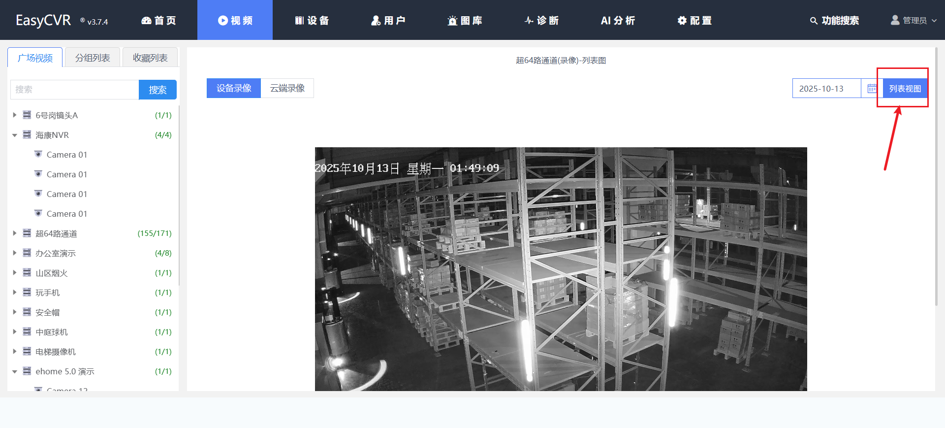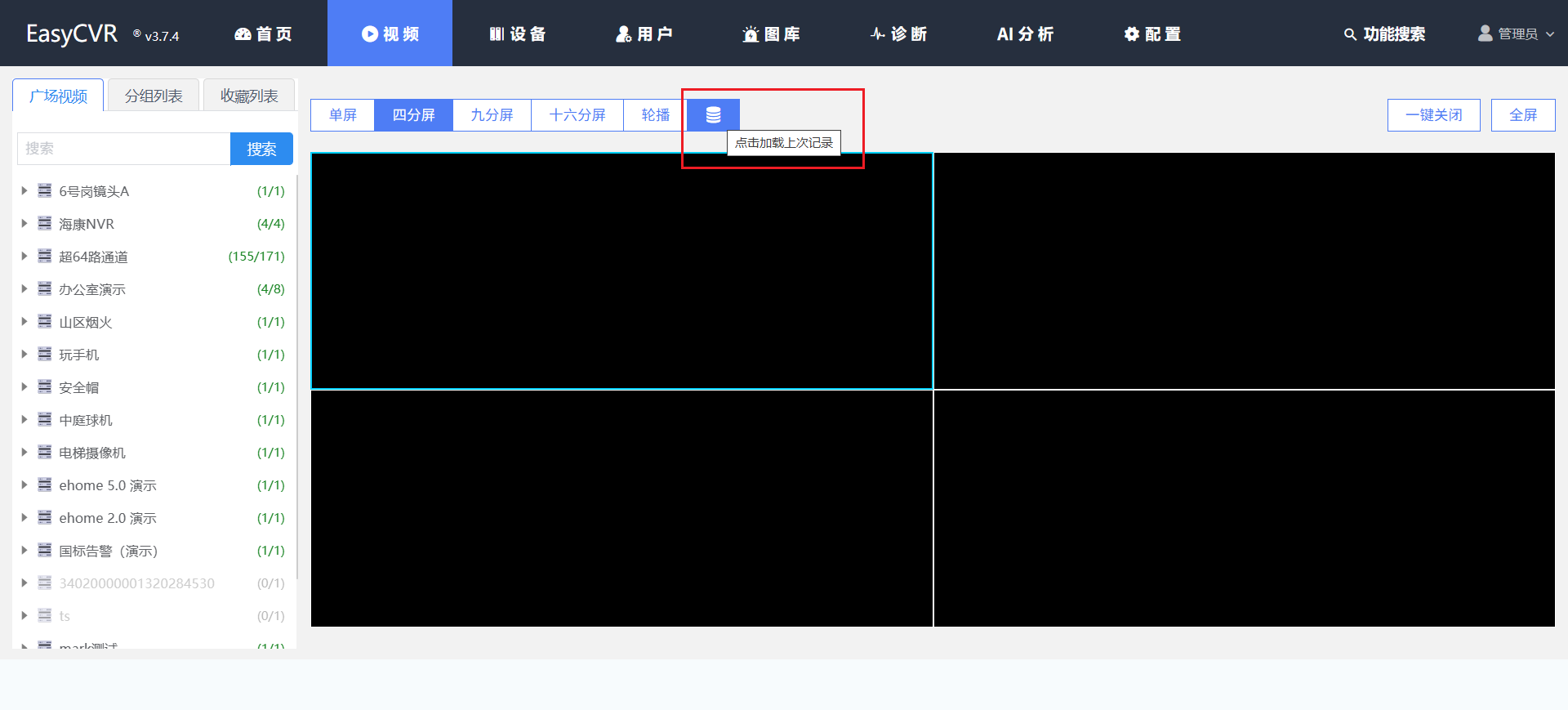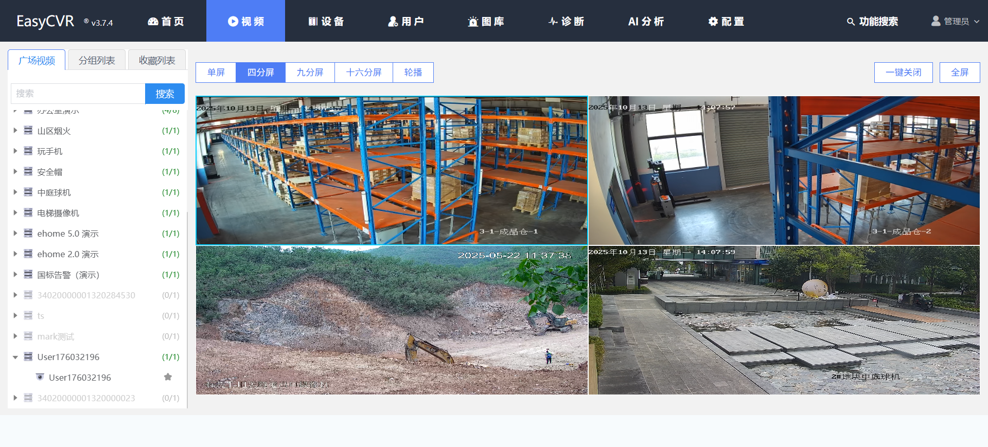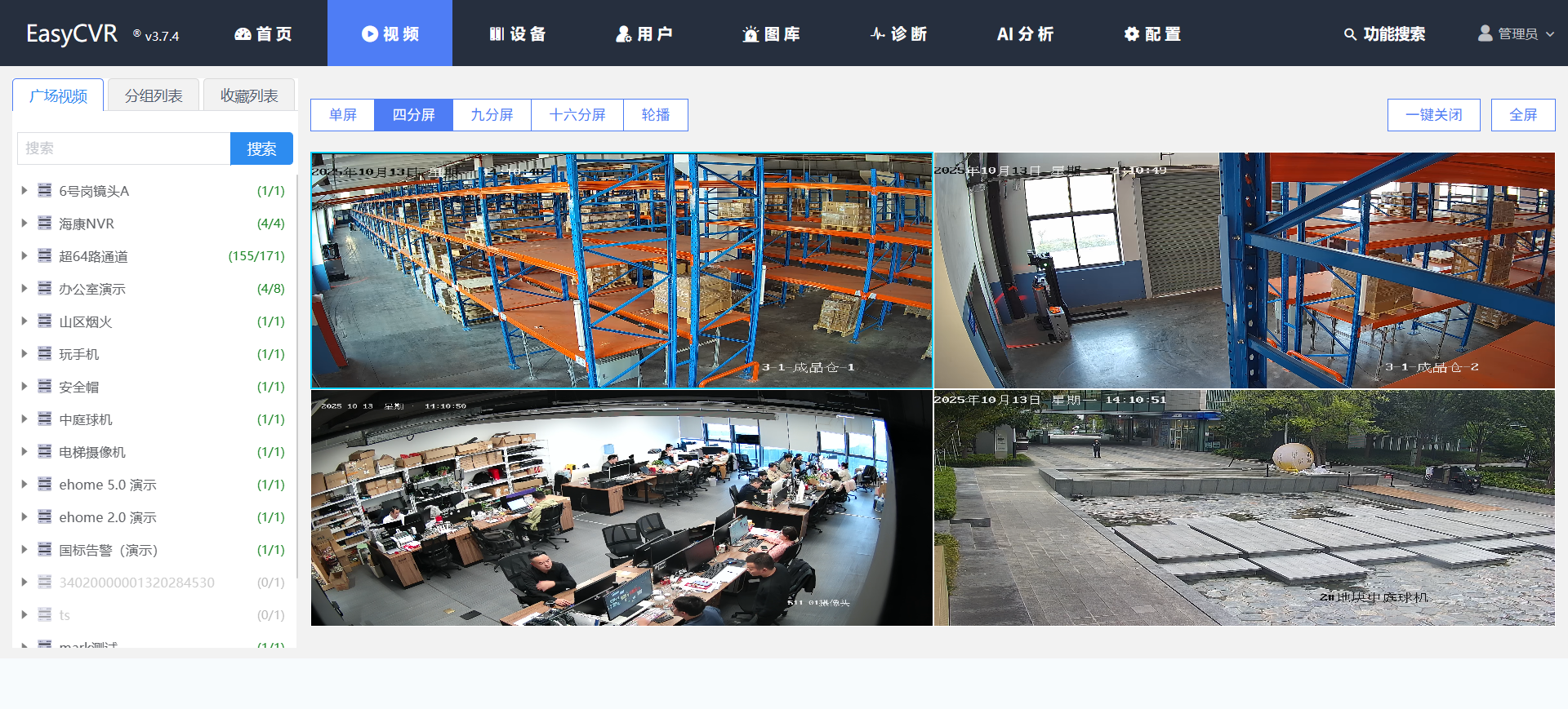 点击左侧【设备列表】下的通道,可调阅实时视频,支持单分屏/4 分屏: