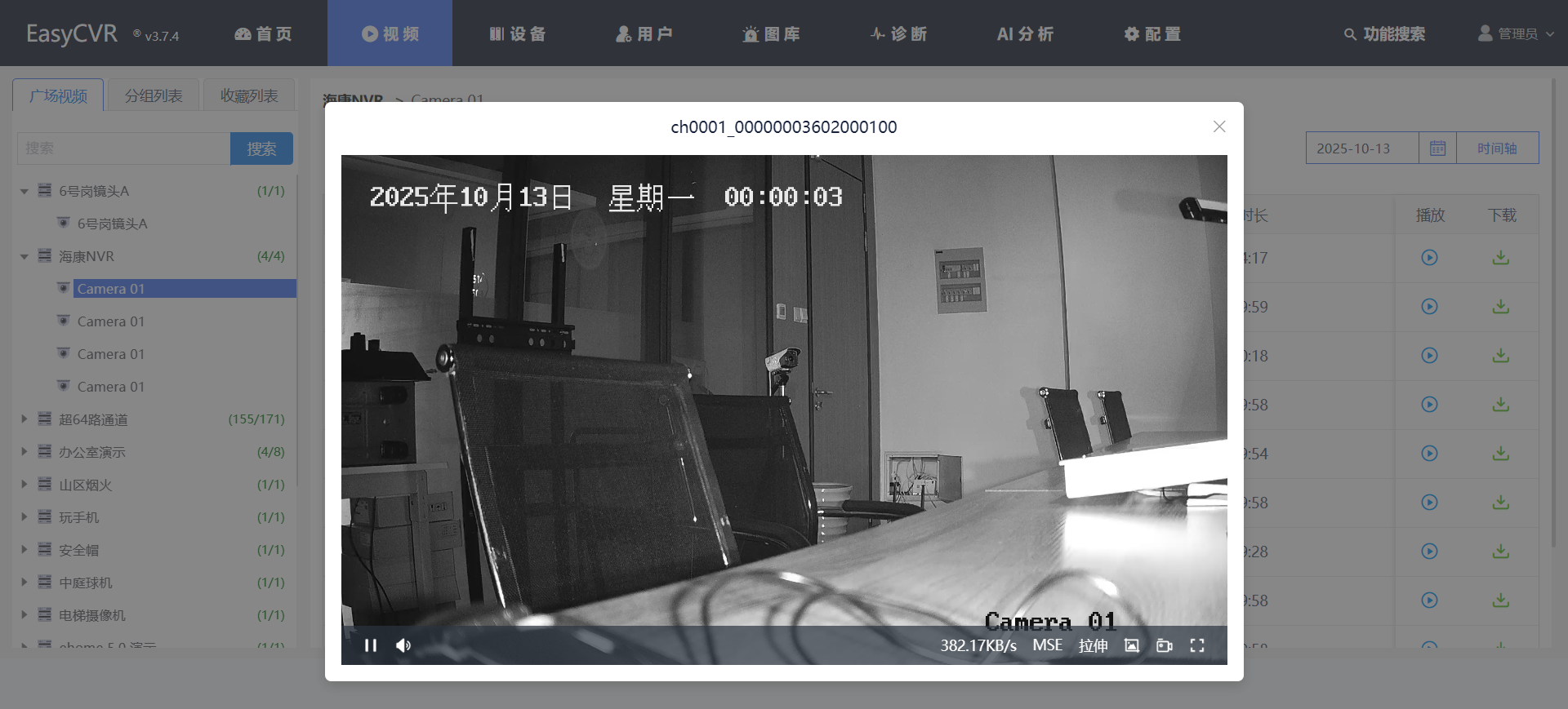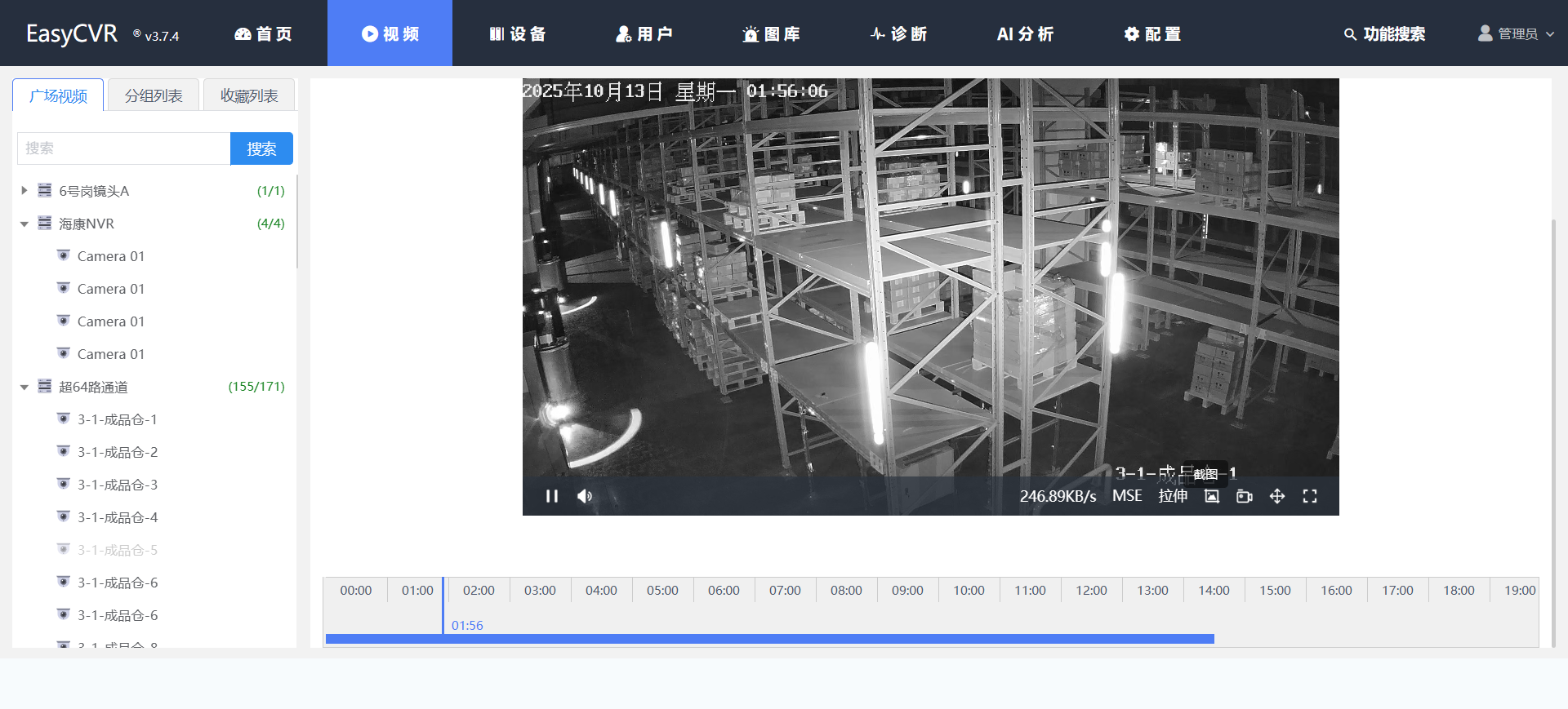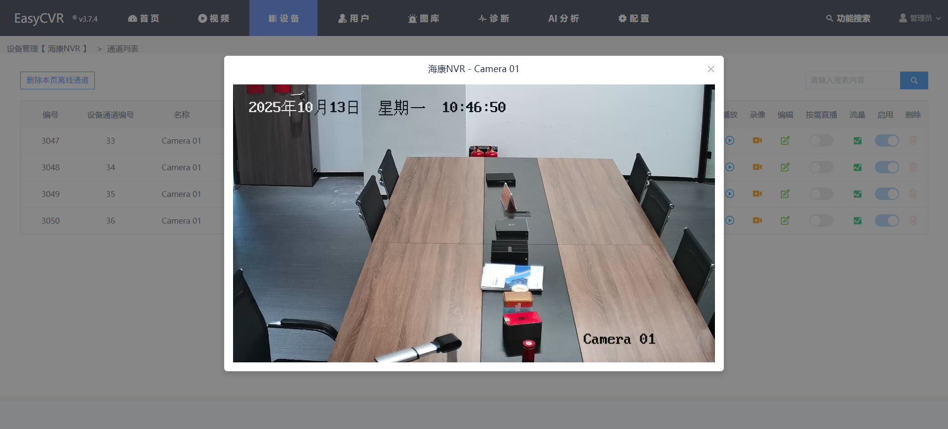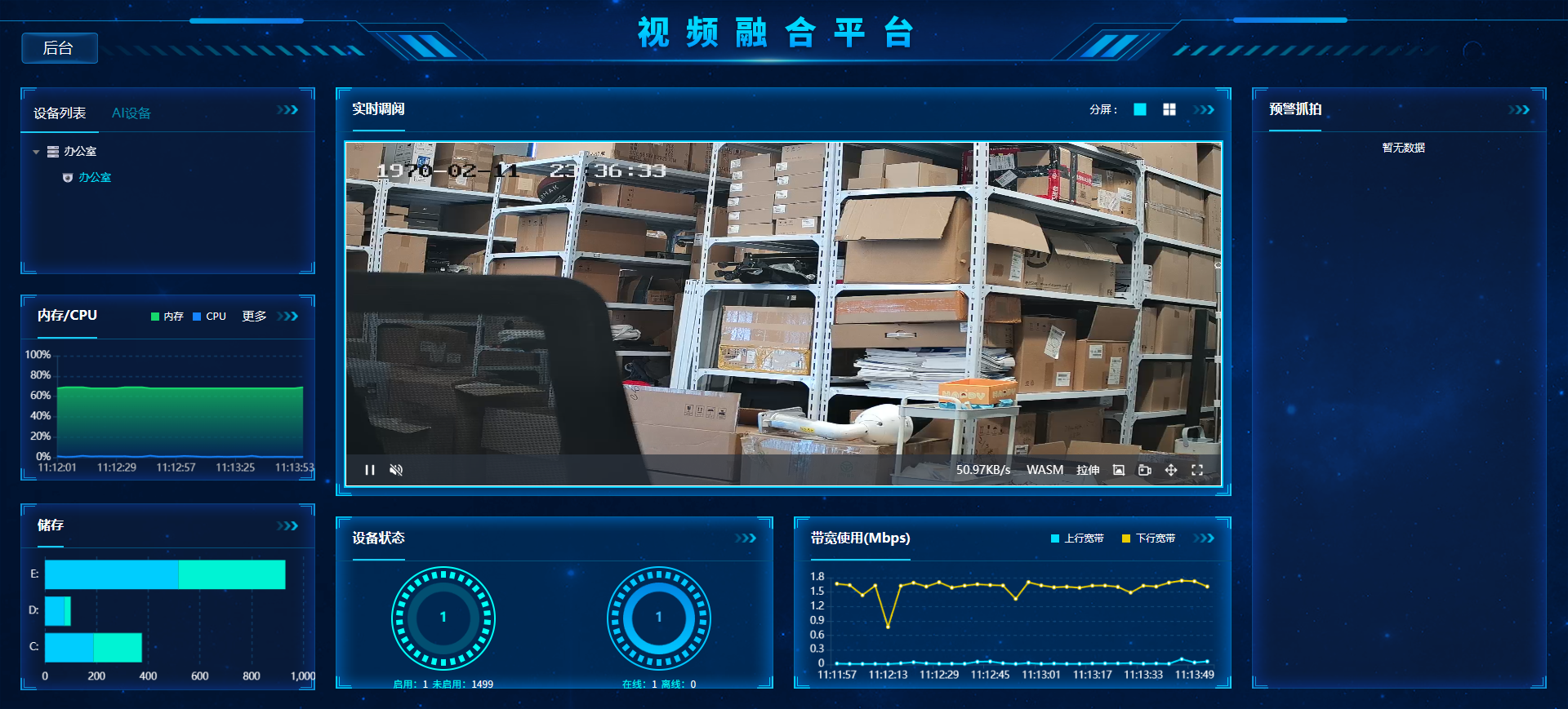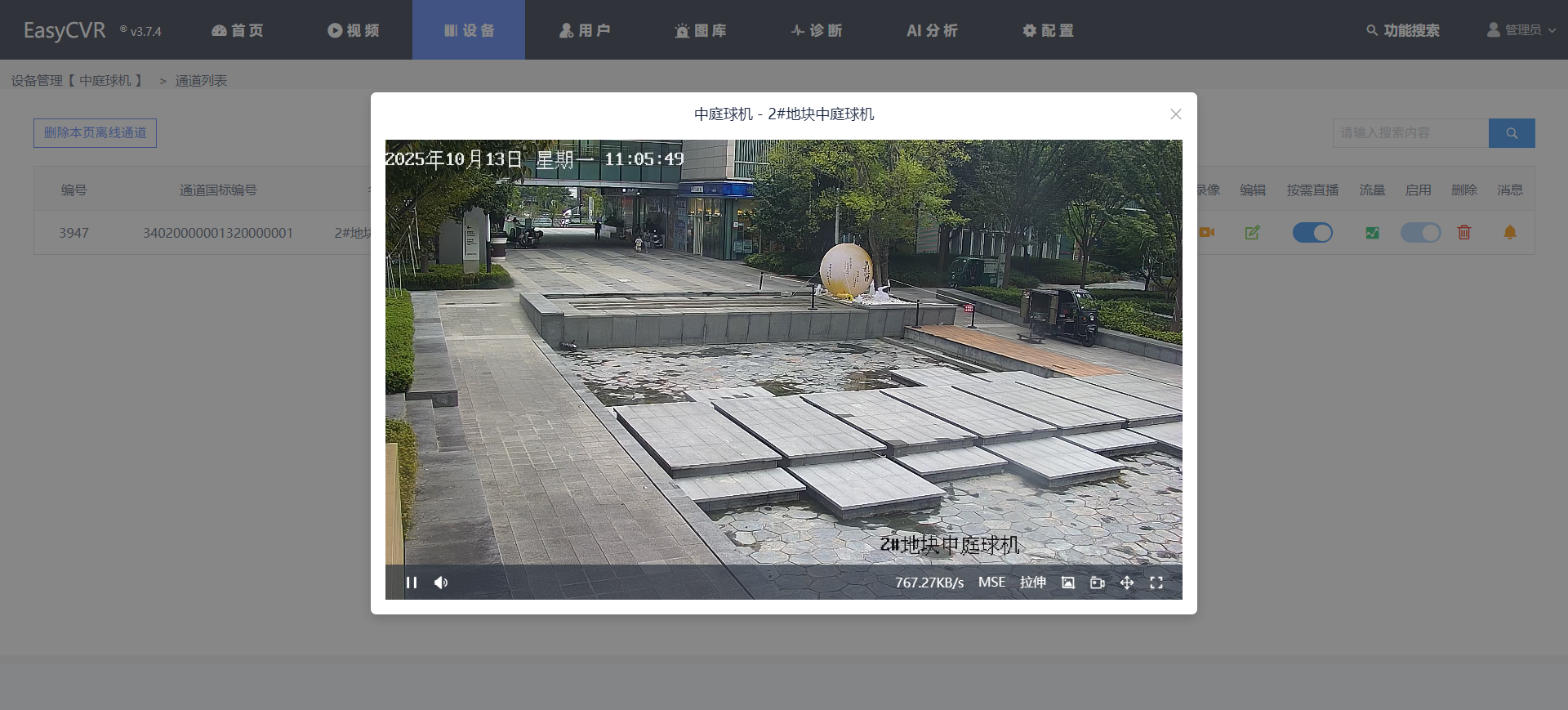 点击左侧【设备列表】下的通道,可调阅实时视频,支持单分屏/4 分屏: