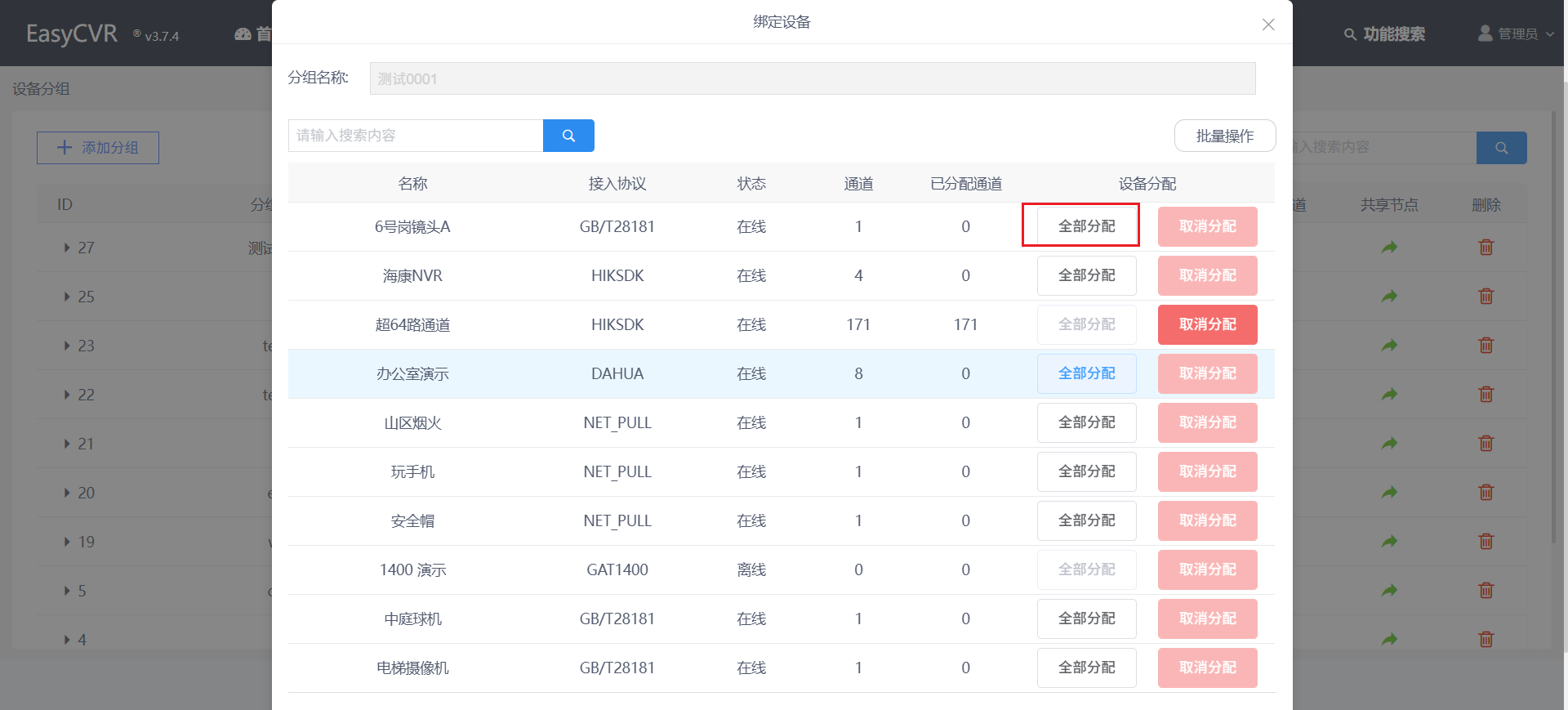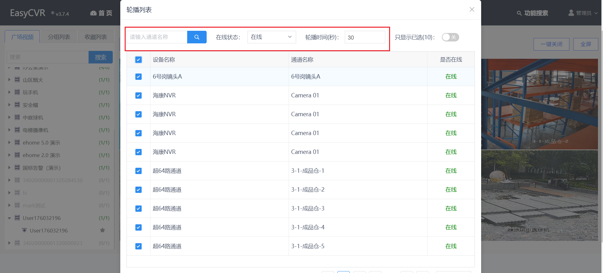 2)然后点击通道按钮,勾选需要级联上去的通道;支持手动更新设备。