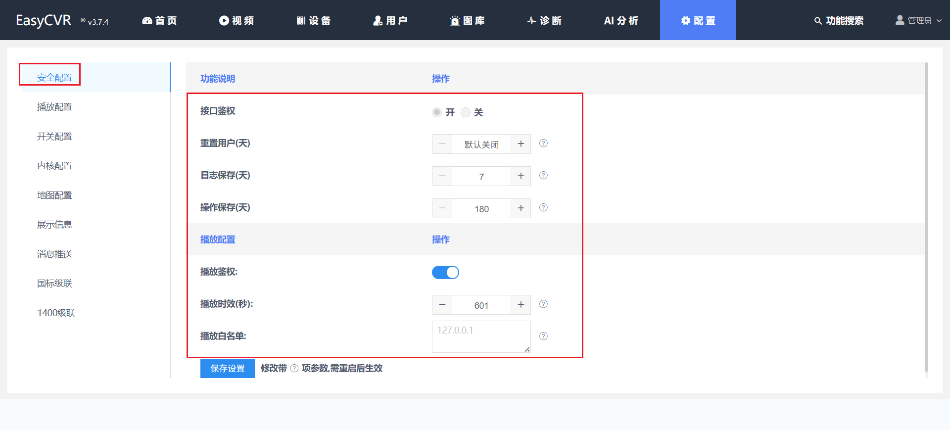 包括 token 超时时间、RTSP 拉流超时时间、国标设备收流超时时间、设备保活超时、流媒体运行方式(进程方式/服务方式)、服务端口配置。