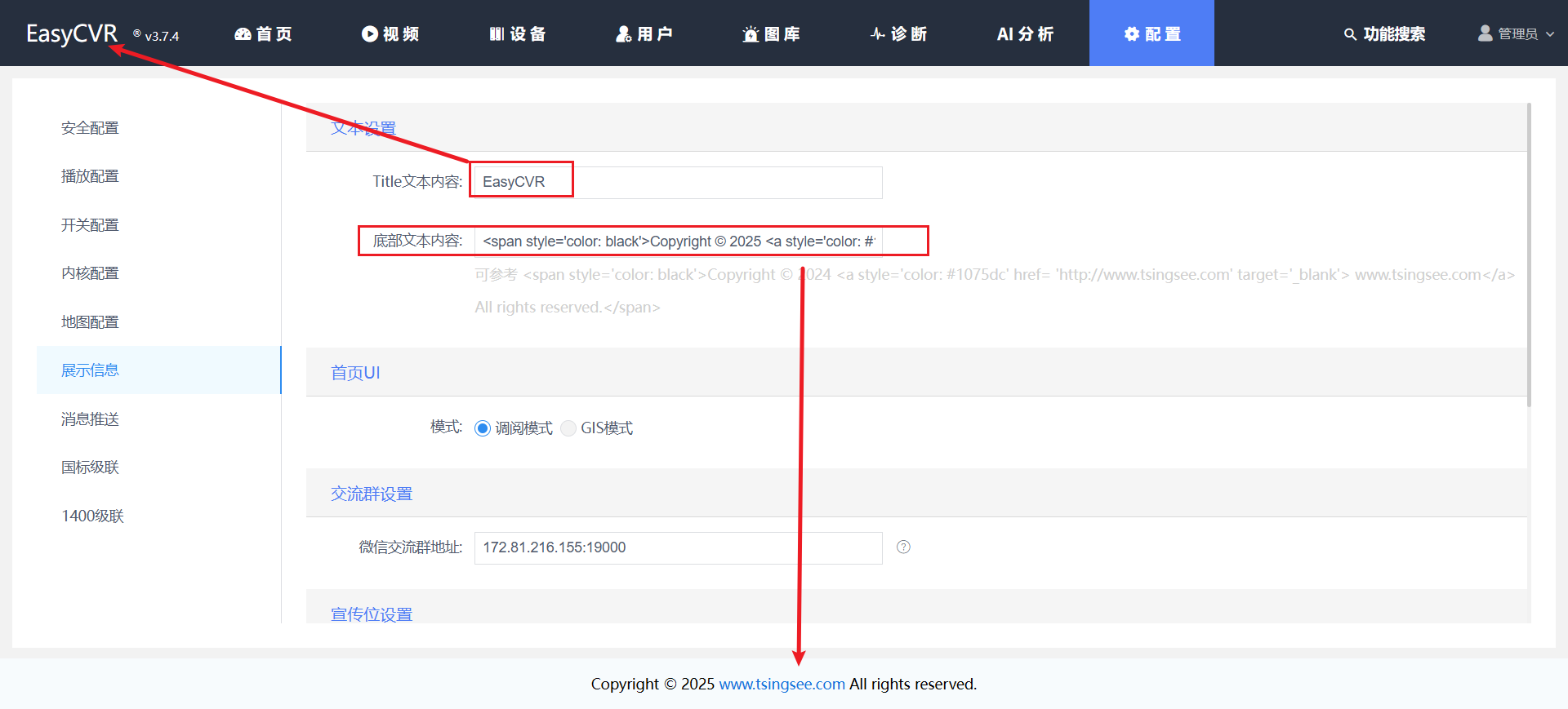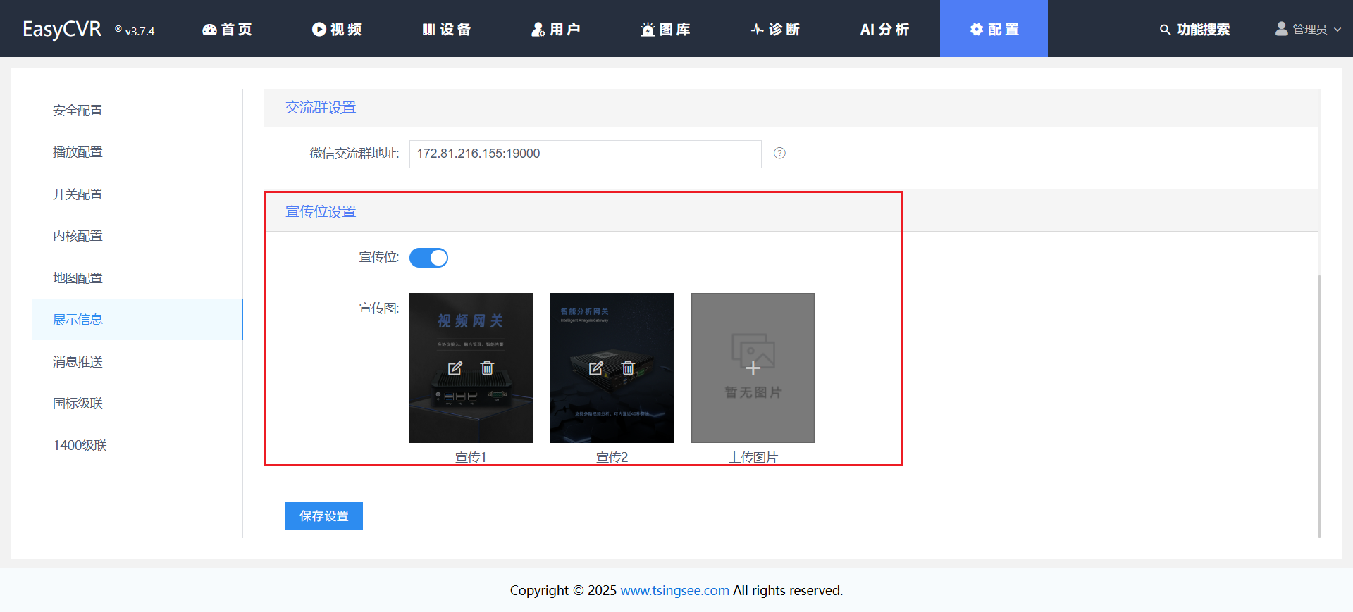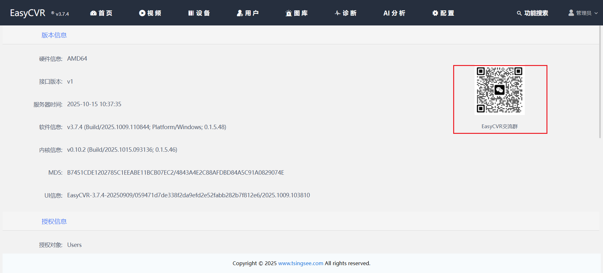 3)交流群设置:可配置微信交流群地址(将显示在版本信息页面中),设置为空则不显示交流群二维码;