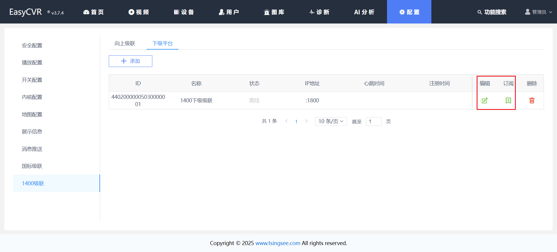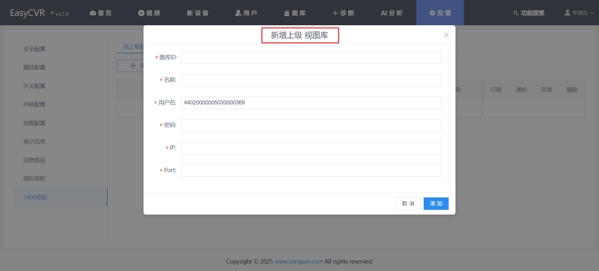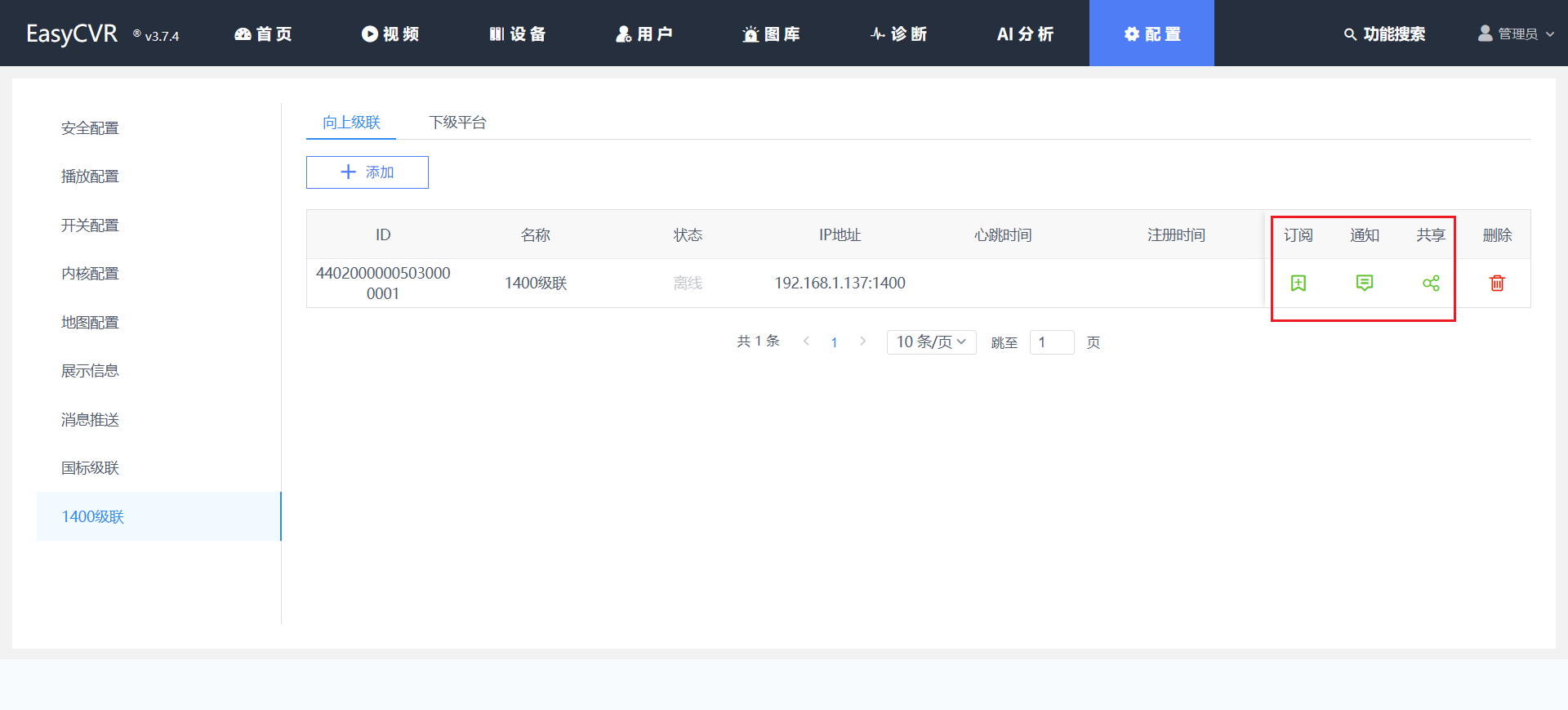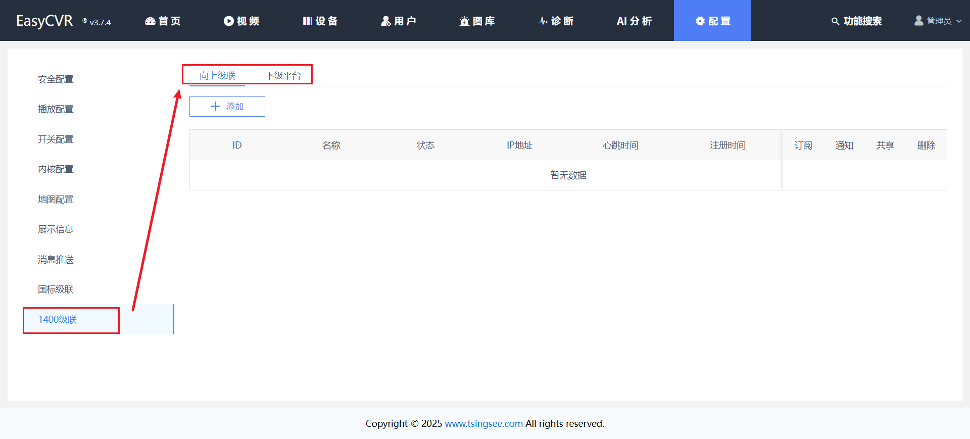 EasyCVR 平台支持与 1400 协议平台进行上下级的级联。