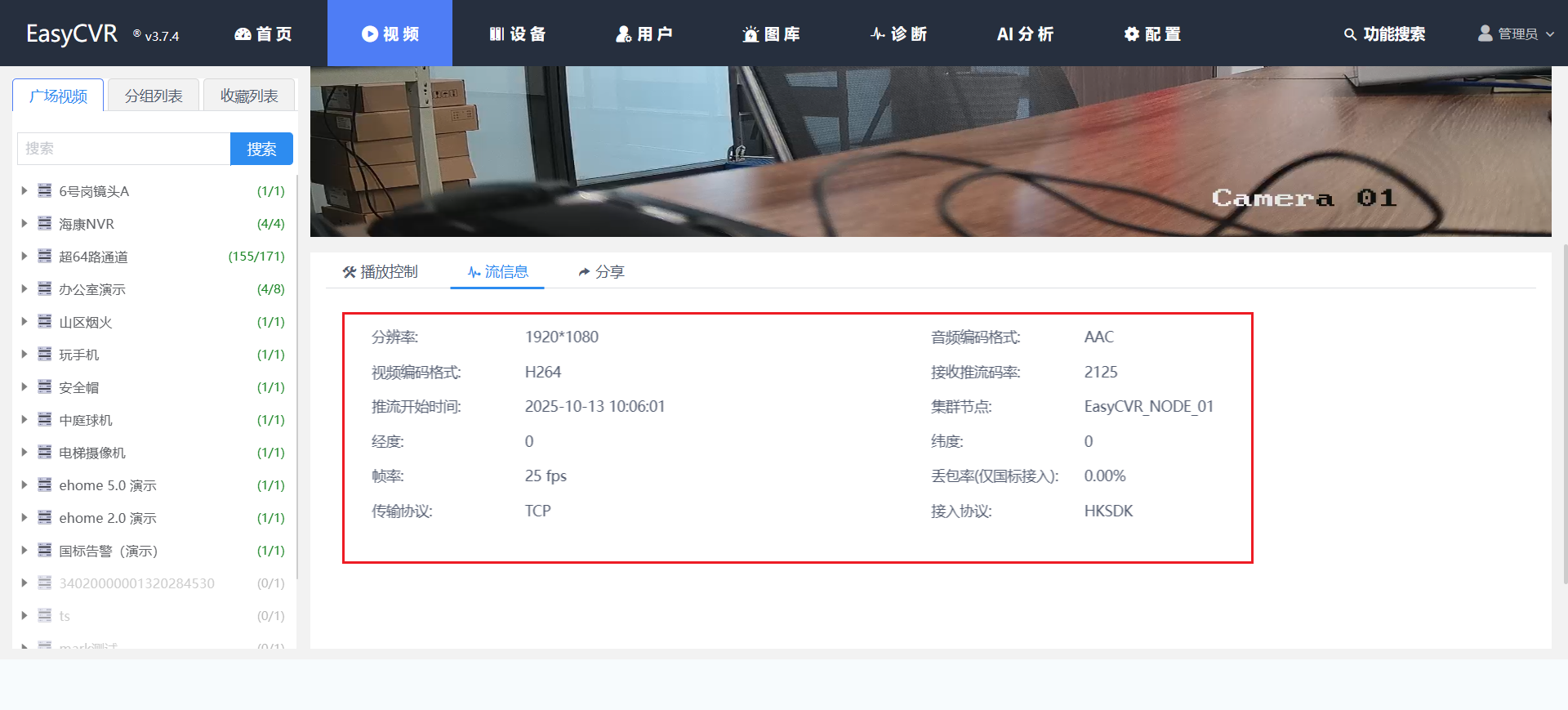 视频实时调阅界面展示当前通道的相关视频信息(传输协议、接入协议、视频编码格式、音频编码格式等)。