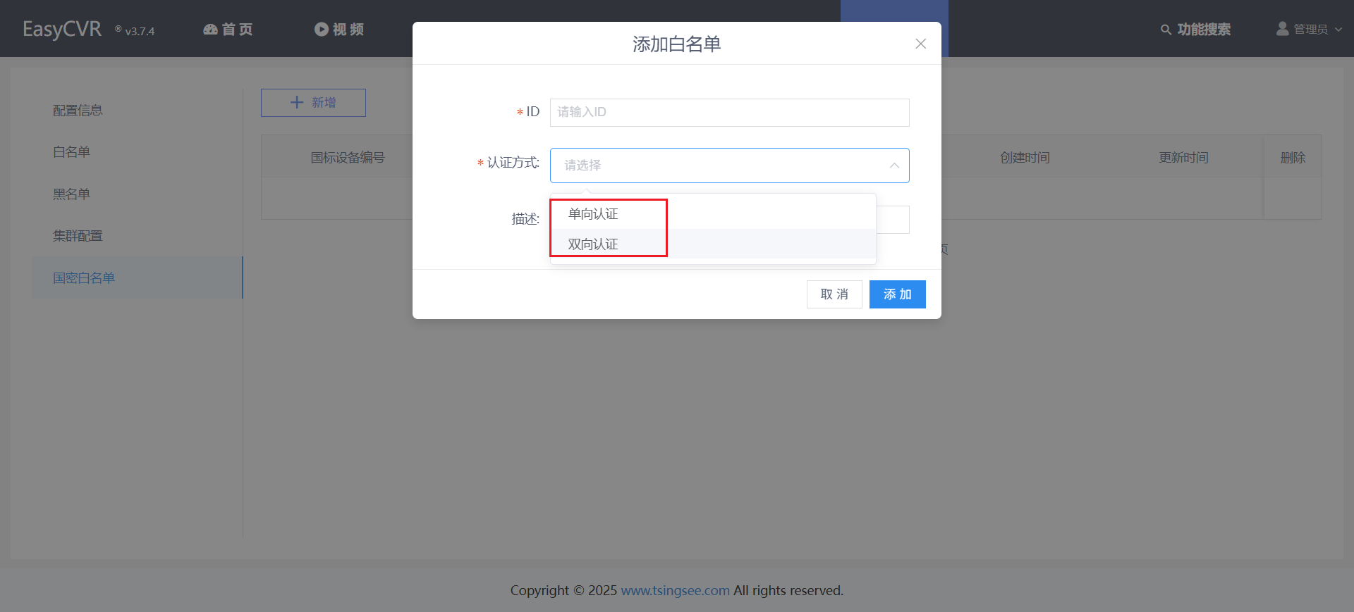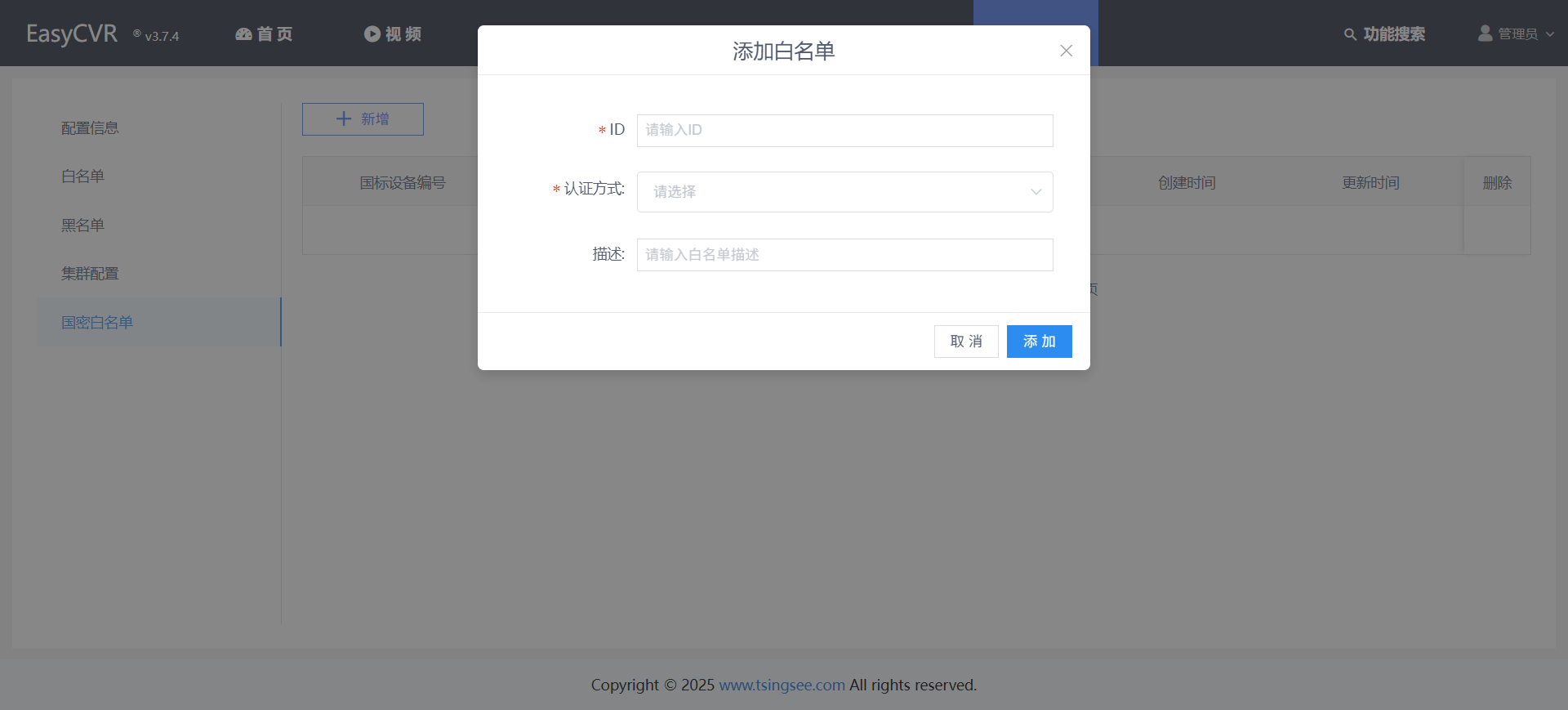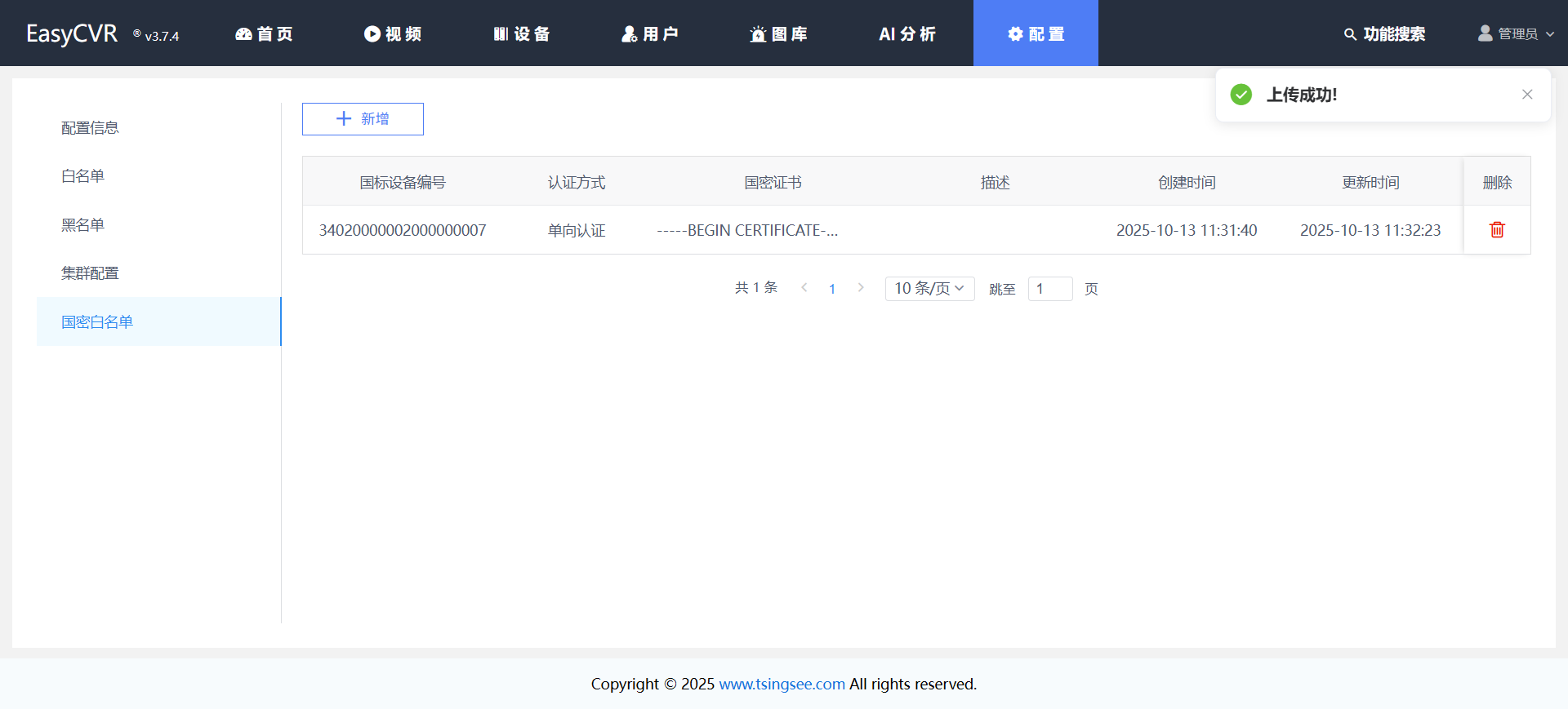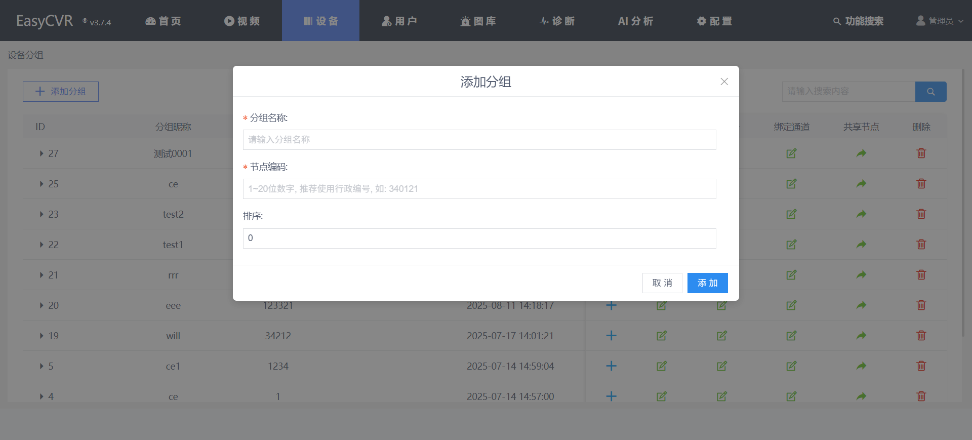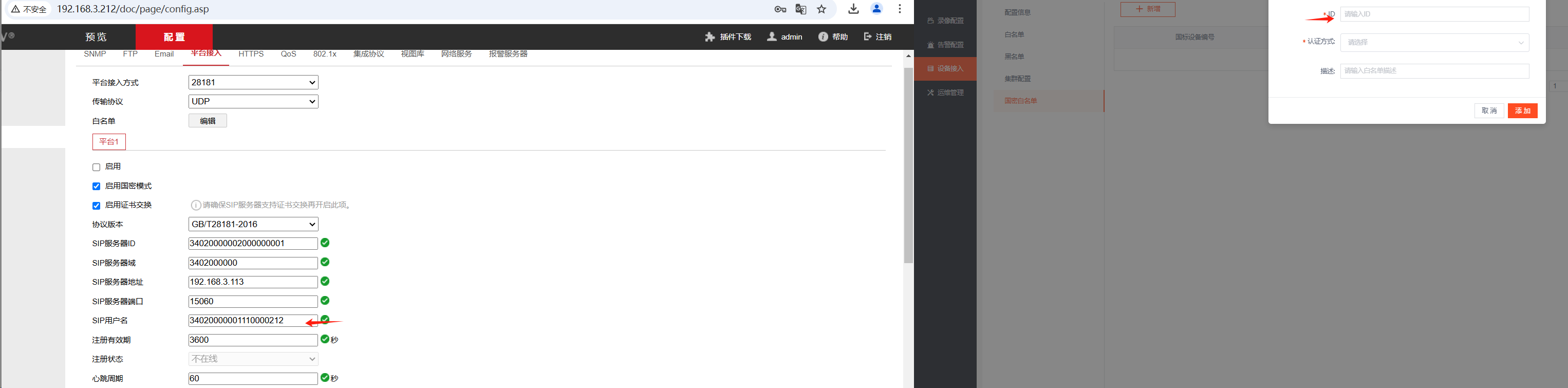 在这里配置完成上级国标平台的 SIP 信息后,勾选【启用】,然后点击【添加】,在级联管理页面能看到是否在线。