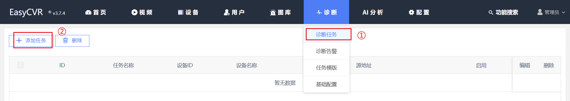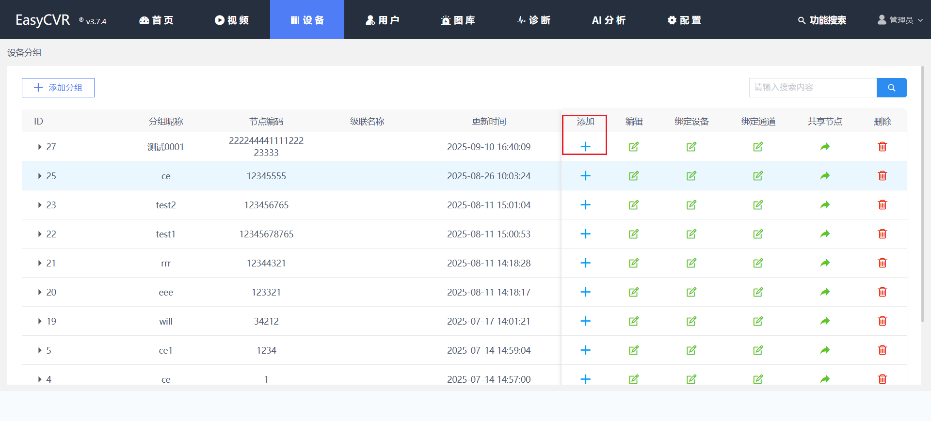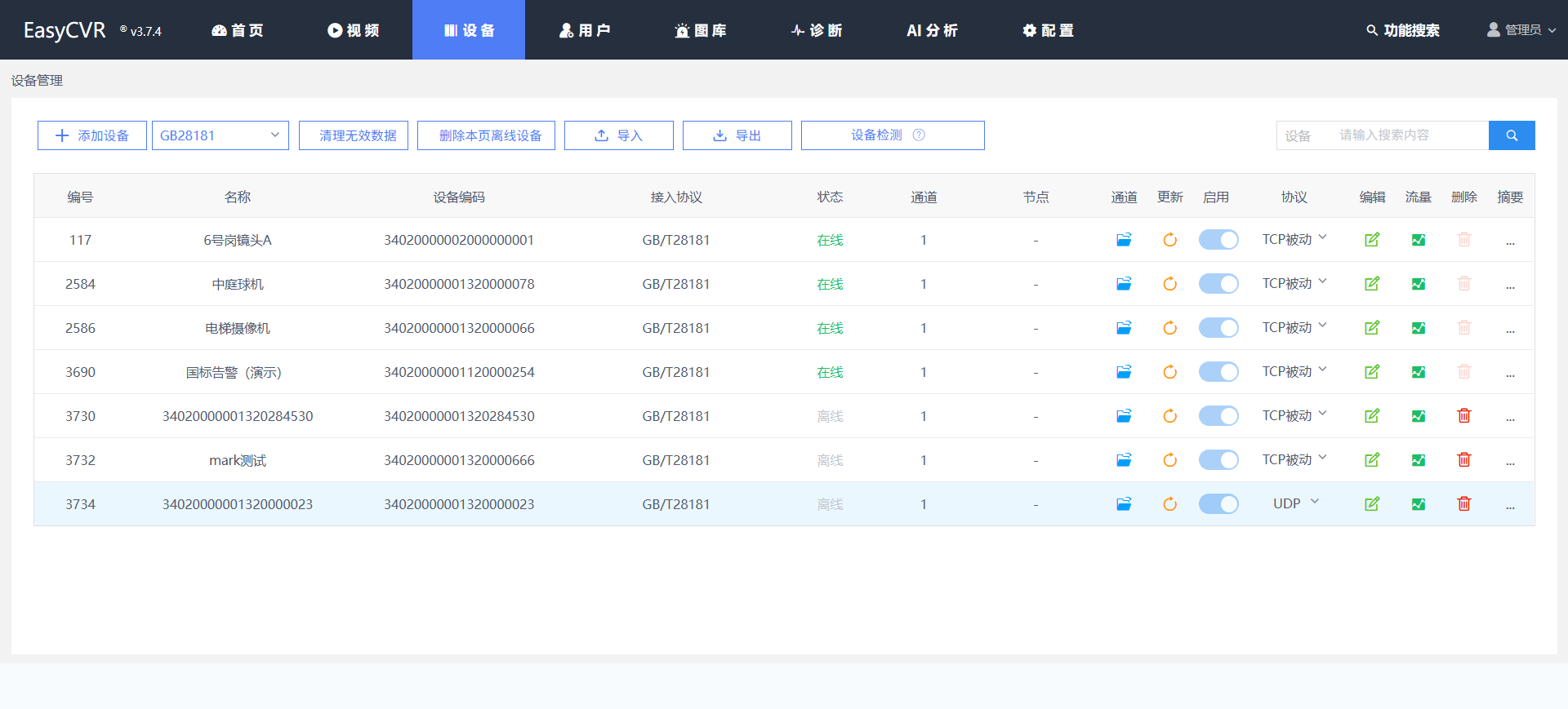 1)点击导航栏【设备】-【设备管理】,出现以下设备配置接入页面,点击【添加设备】(支持批量导入/导出设备):