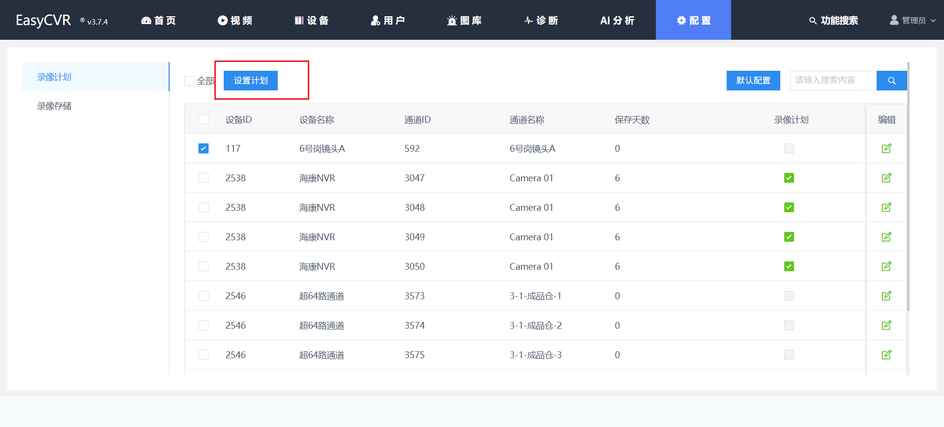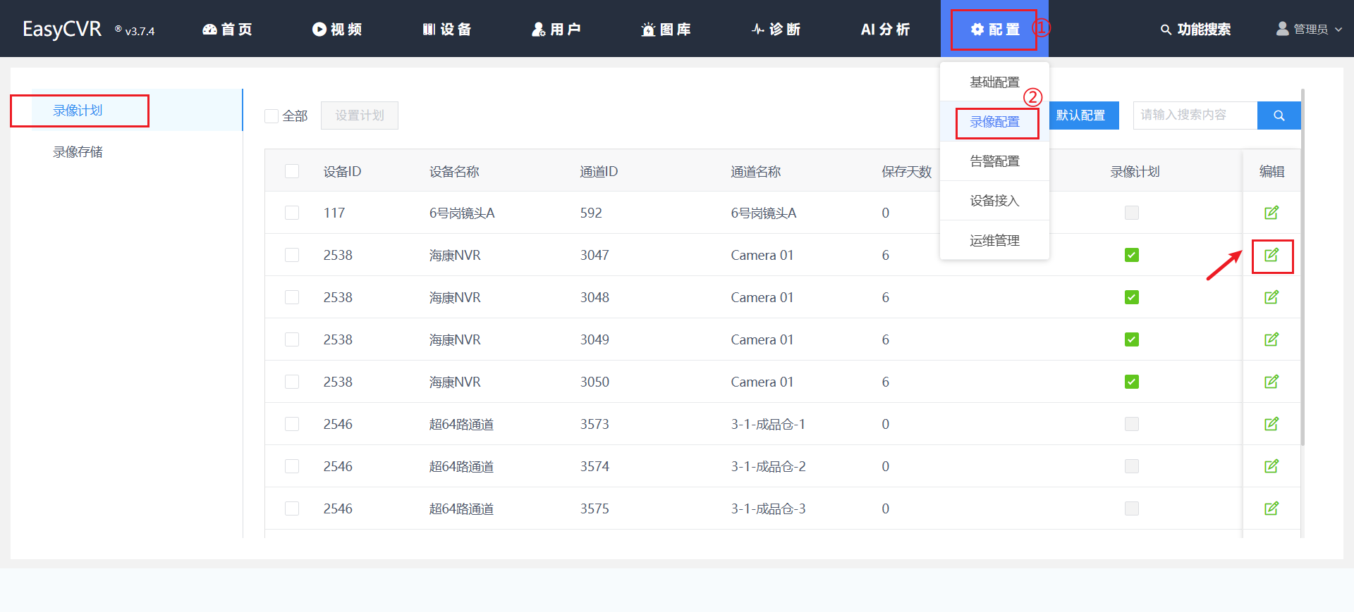 在导航栏点击【配置】-【录像配置】,在【录像计划】页面点击通道后面的编辑按钮,开启录像计划以及选择录像计划时间: