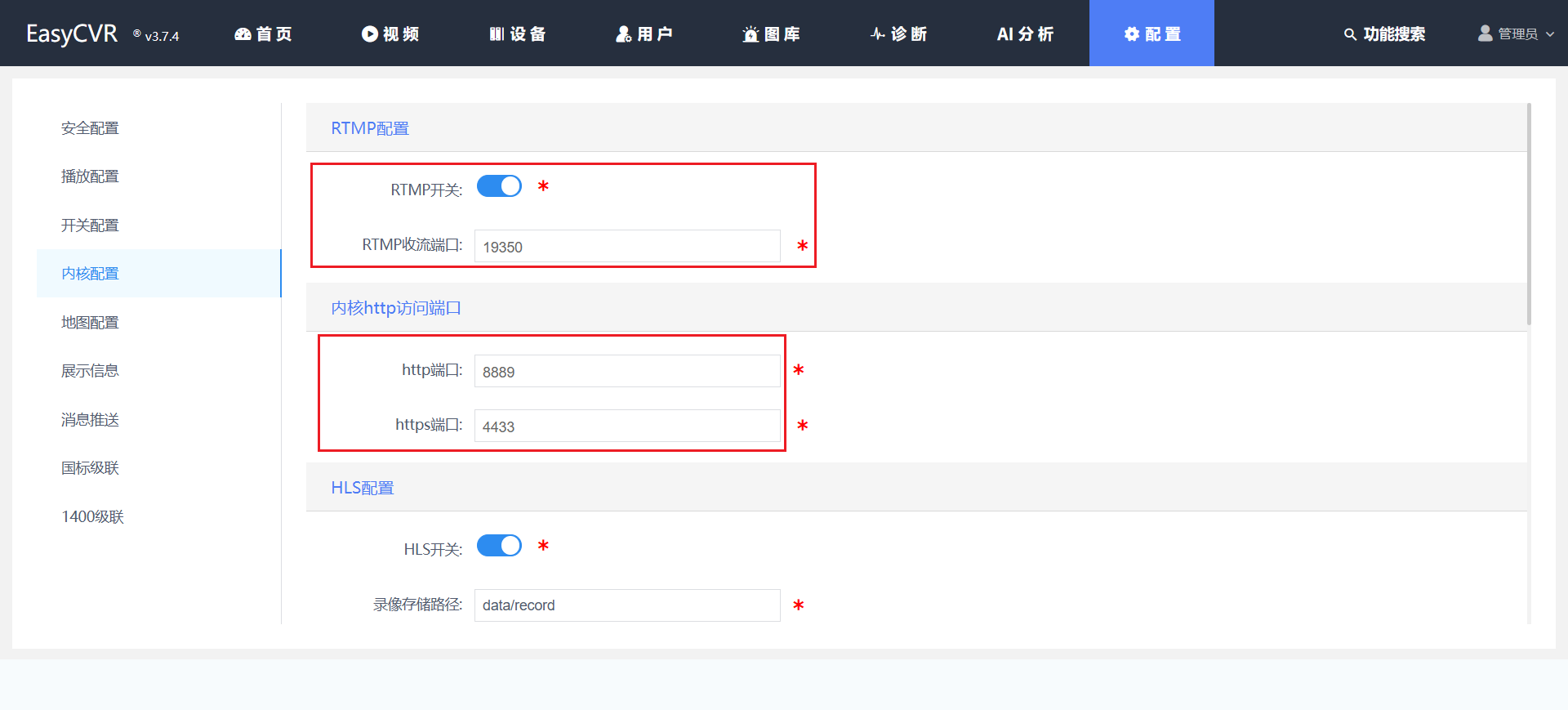 在此处配置 RTMP、内核 http/https 访问端口、HLS、WebRTC、RTSP、日志等。