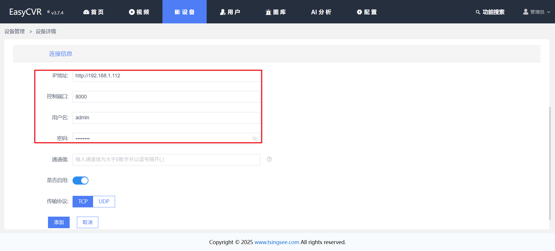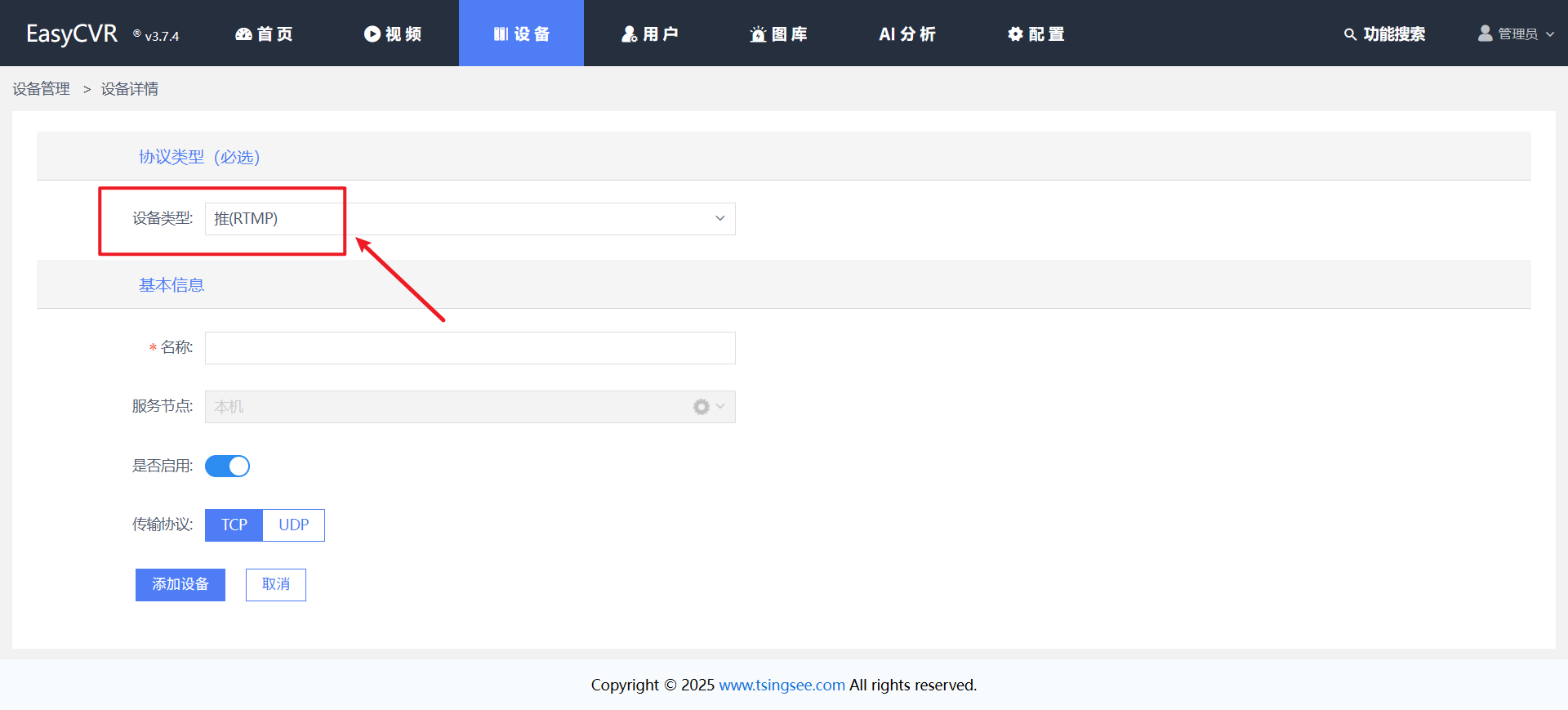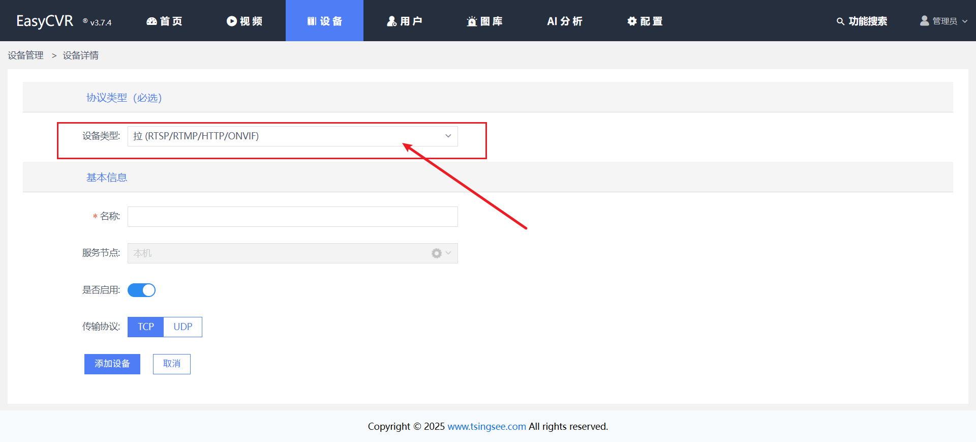 2)在接入设备详情页面选择接入类型,选择【拉(RTSP/RTMP/HTTP/ONVIF)】,输入设备名称,(传输协议默认是 TCP,也可以切换为 UDP),随后点击【添加】即可。