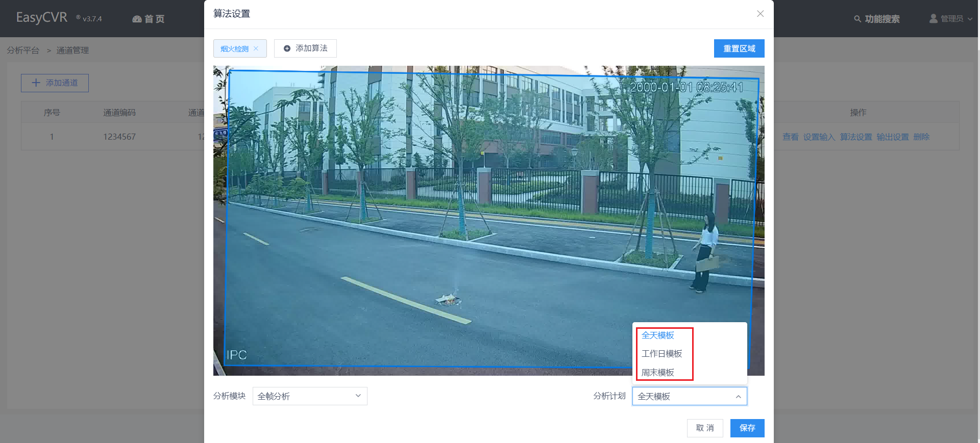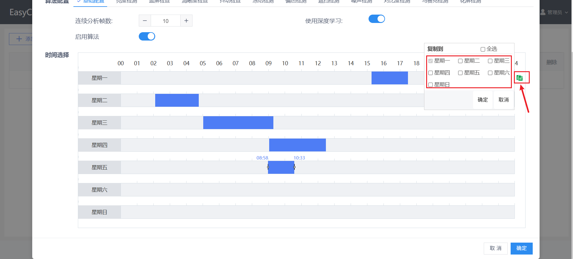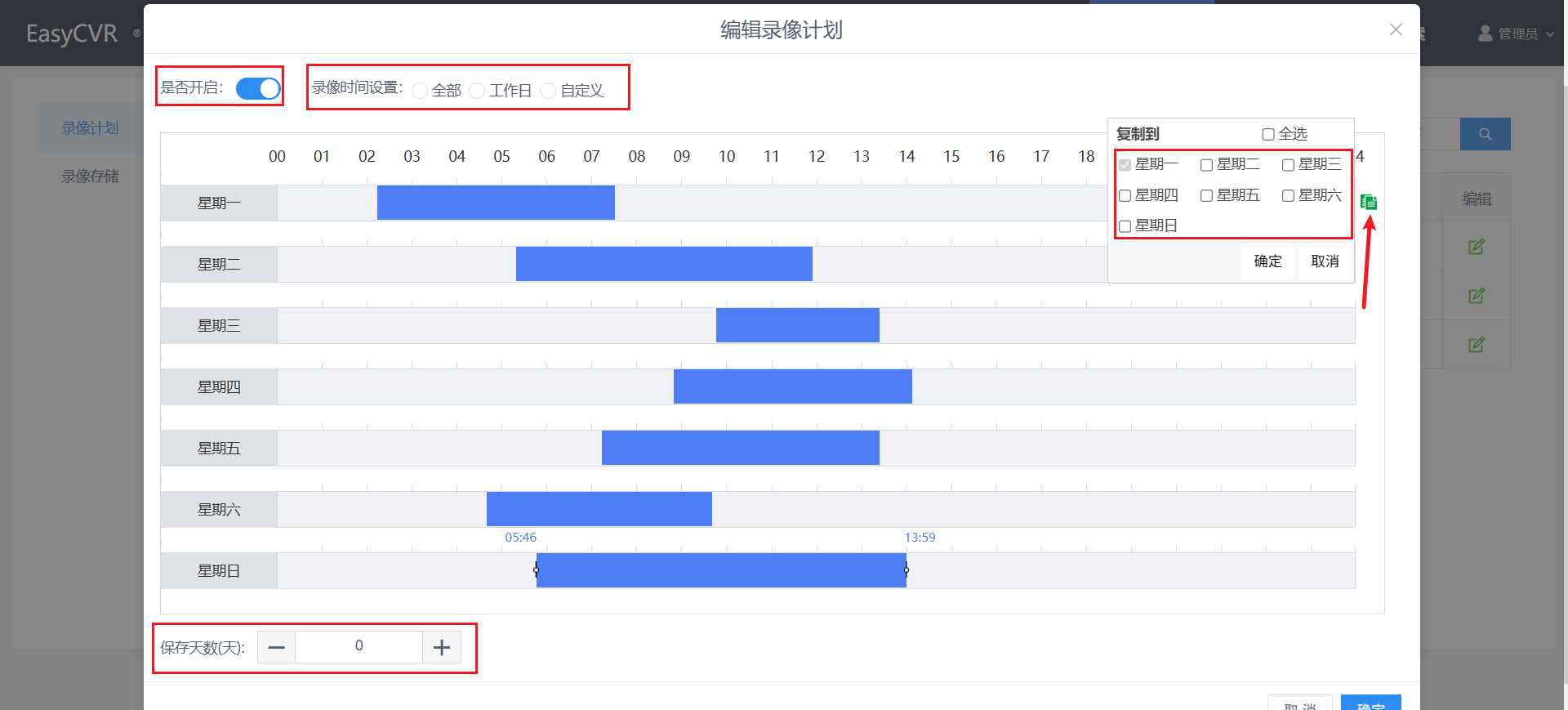 支持选择全部、工作日、自定义模式,可以拖动时间轴进行自定义时间的设置,也可以将自定义时间复制到其他日期,为用户省去重复操作的工作。支持自定义录像存储天数。
