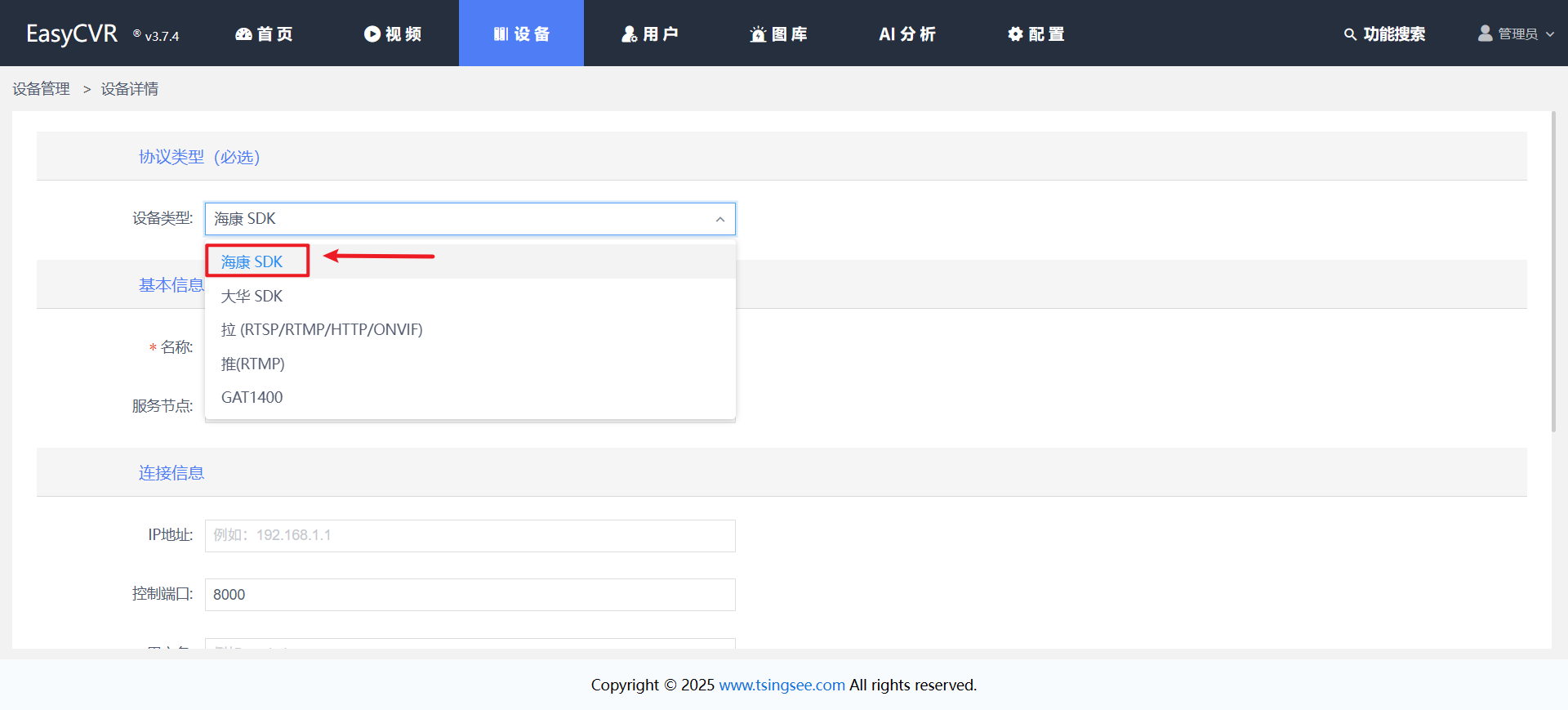 手动添加的设备协议包含:RTSP/RTMP/HTTP/ONVIF 拉流协议、RTMP 推流协议、海康 SDK 协议、大华 SDK 协议、GA/T 1400 协议。