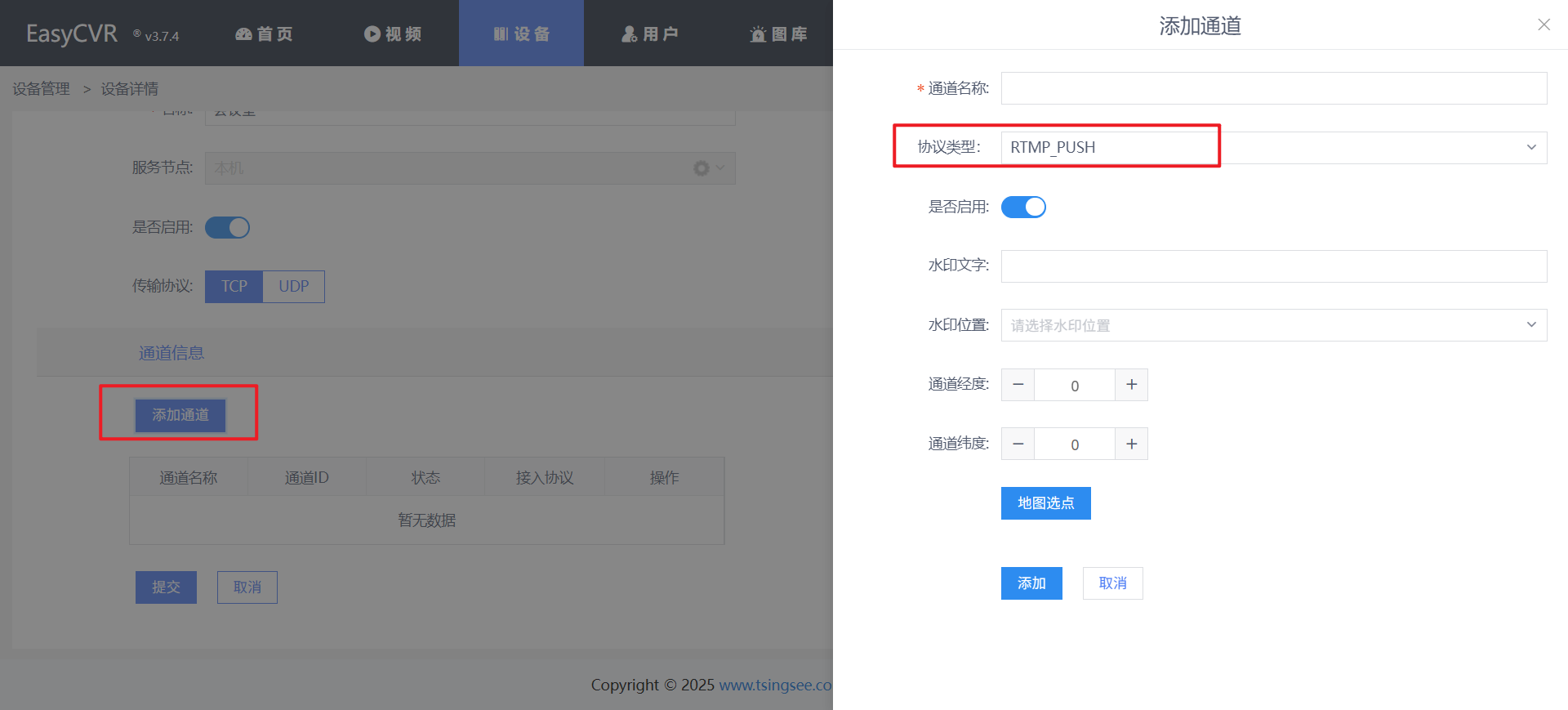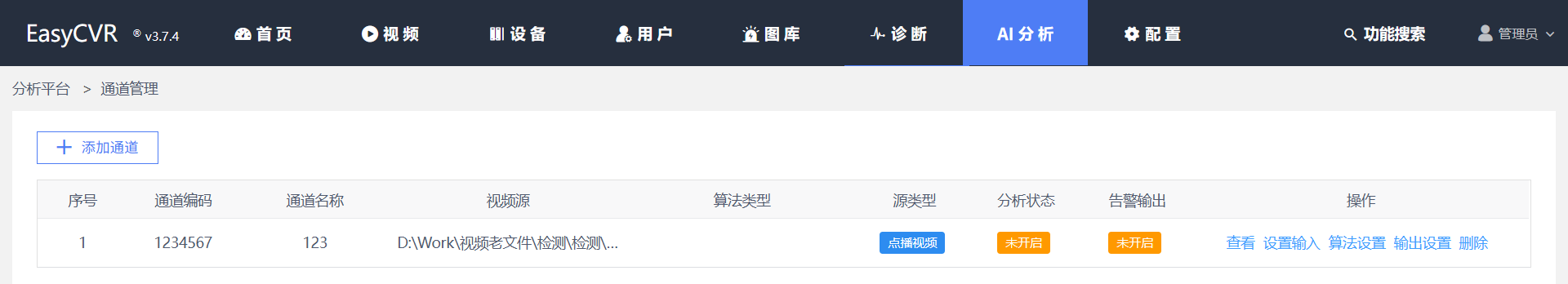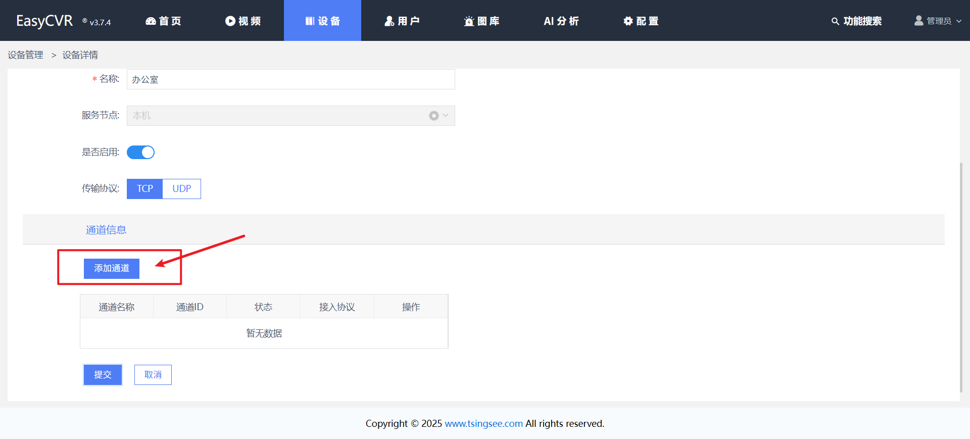 3)设备创建后,接着添加通道,点击页面下方的【添加通道】,如下: