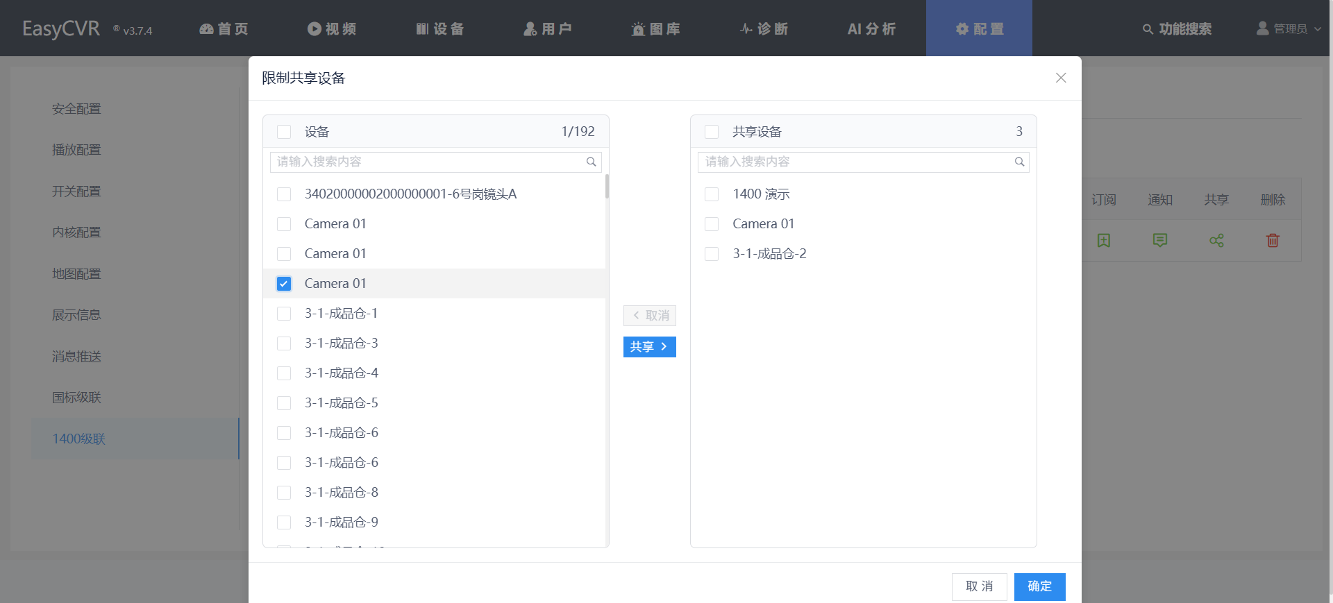 2)添加成功后,点击共享图标,选择需要共享的设备/通道。