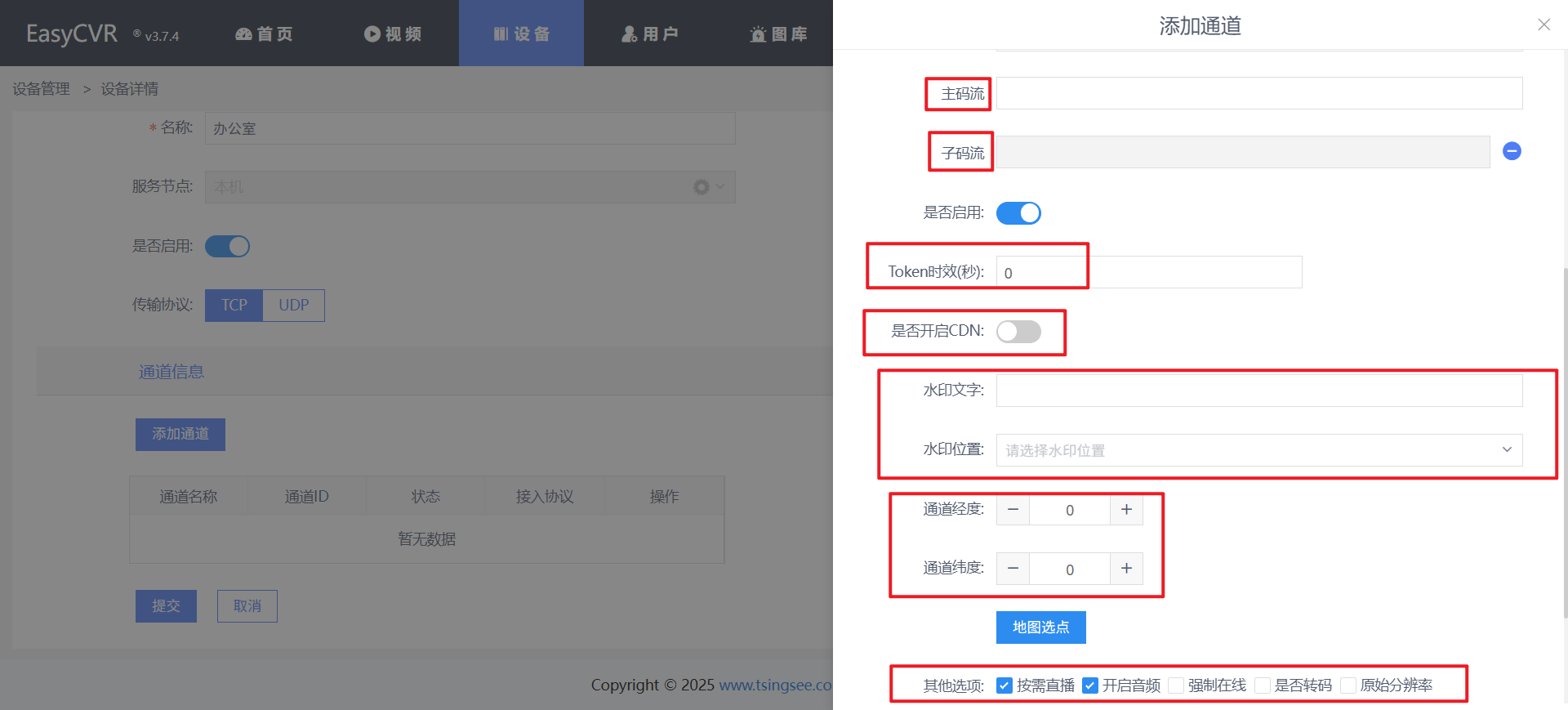 此外,用户还可以根据需求,设置 token 时效、是否开启 cdn、设置水印、设备经纬度,以及按需直播、开启音频、强制在线、是否转码、原始分辨率等。