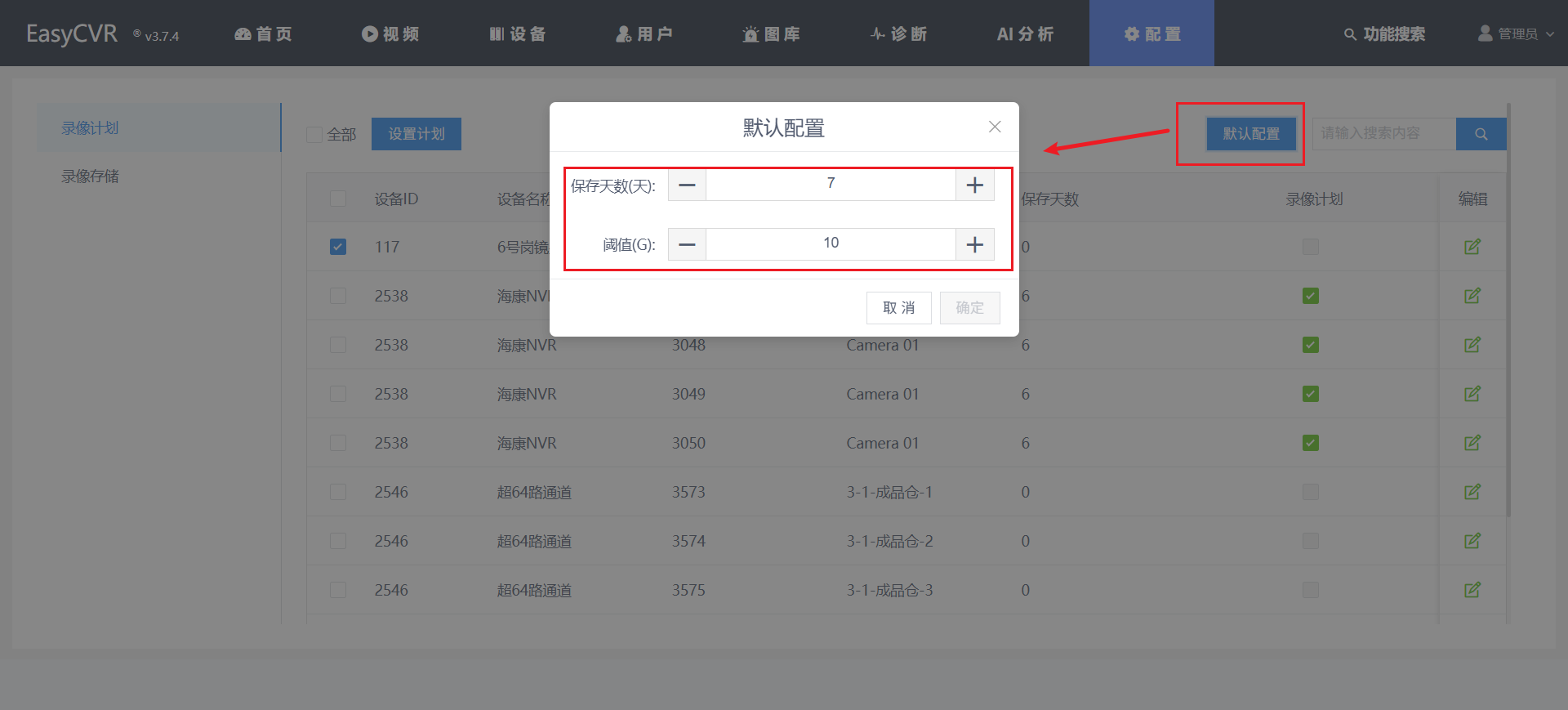 点击【默认配置】,可进行全局配置录像存储天数,存储阈值(磁盘剩余空间 ≤ 阈值,自动删除最早的录像文件)。