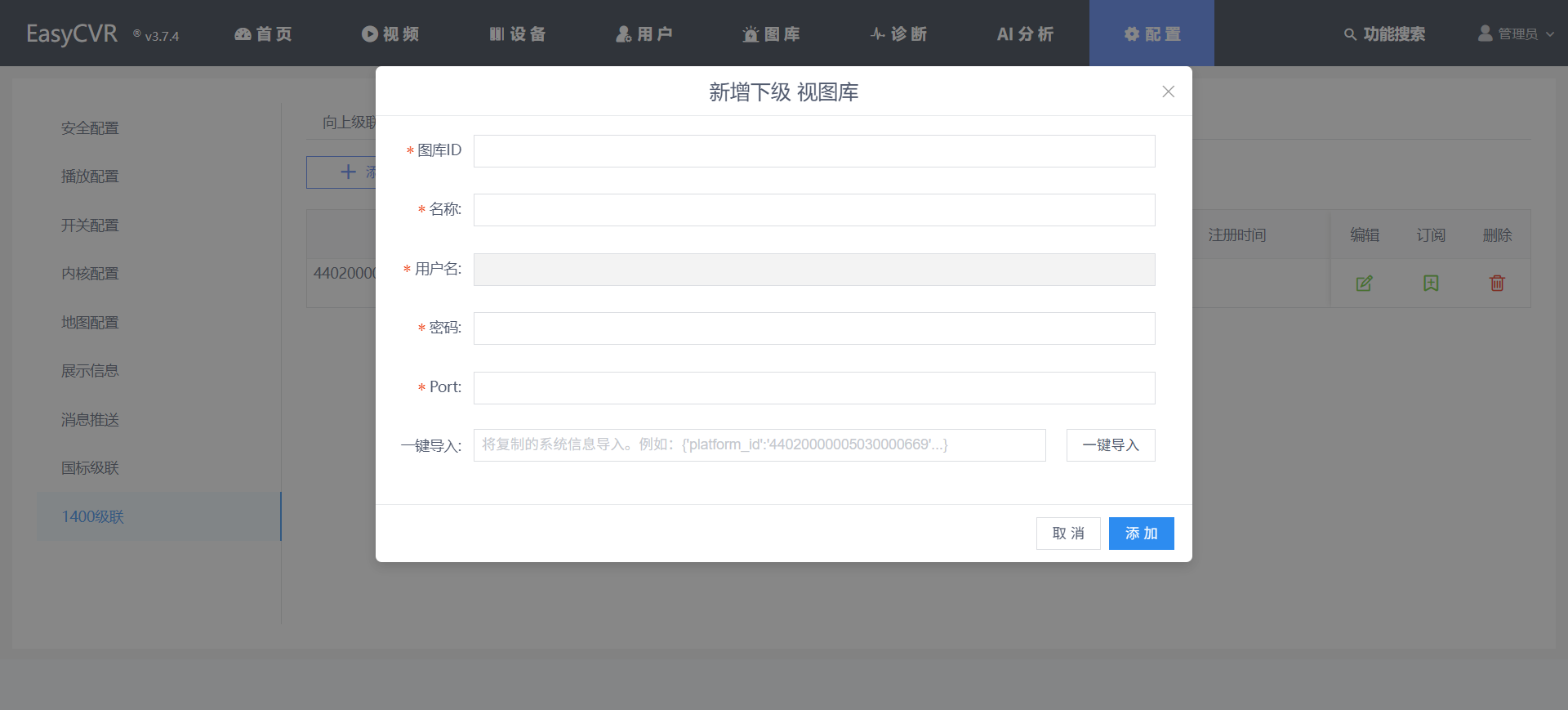 1)点击添加下级平台,填写相关信息,支持一键导入: