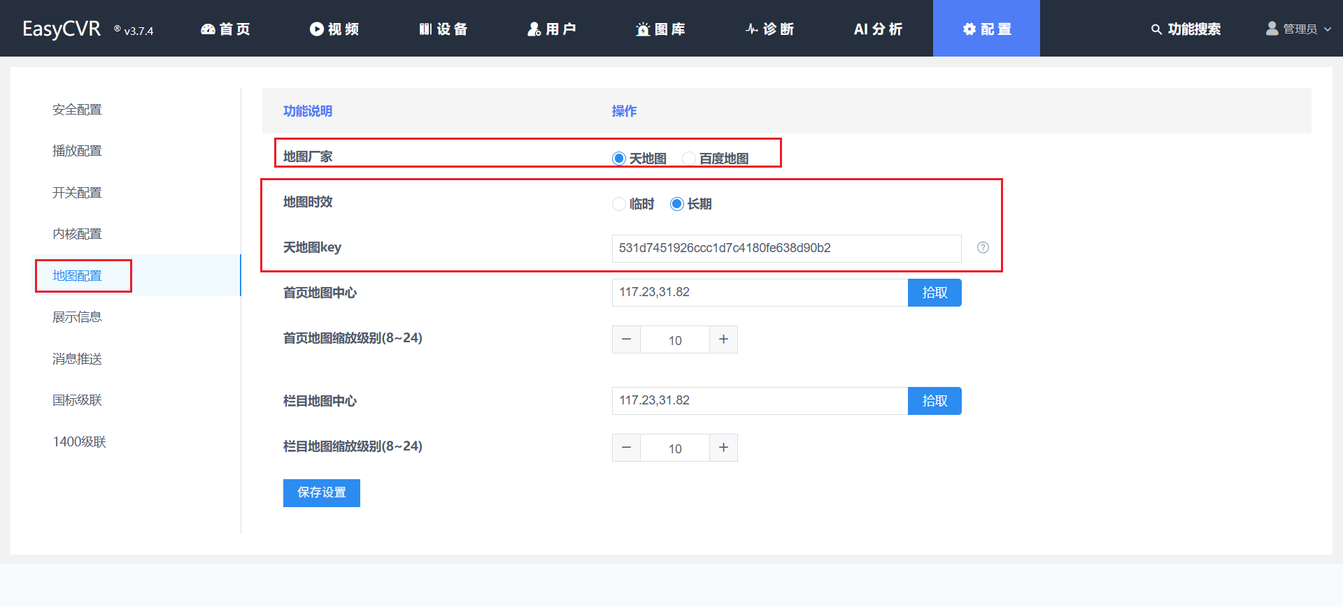 新增地图厂家选项,可选择天地图或百度地图,用户可自主配置地图 key;