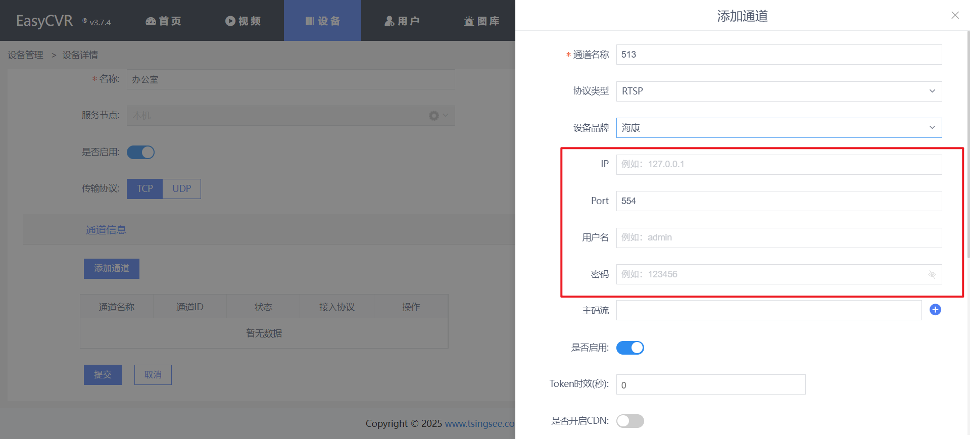 填写通道名称、选择协议类型(RTSP)、设备品牌(海康)、填写摄像机的 IP、用户名、密码等信息,系统会自动生成主子码流信息,端口默认是 554: