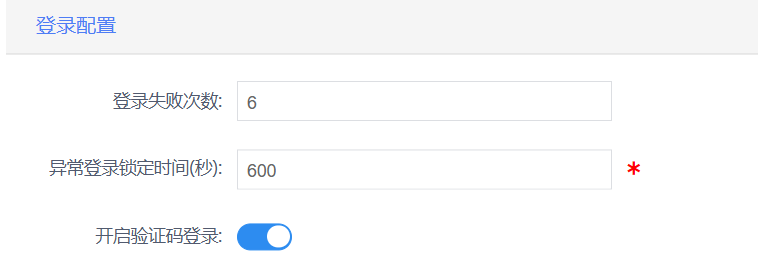 支持配置登录失败的次数、异常登录锁定时间、是否开启验证码登录。