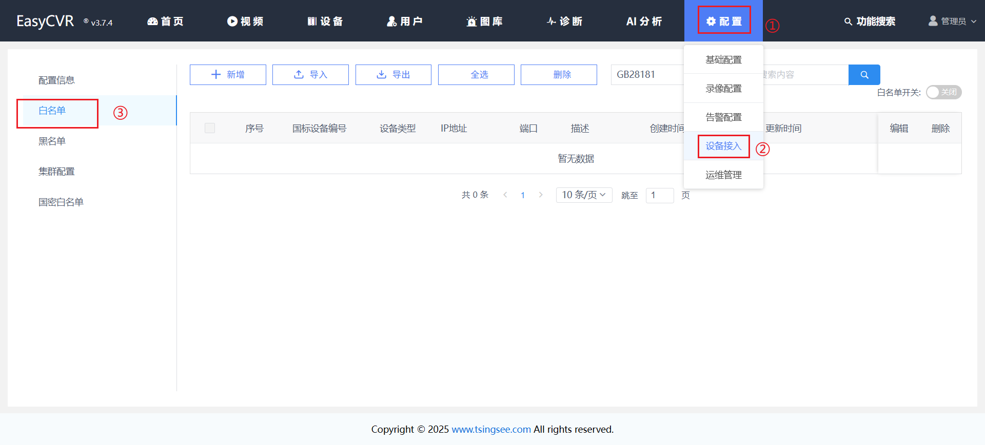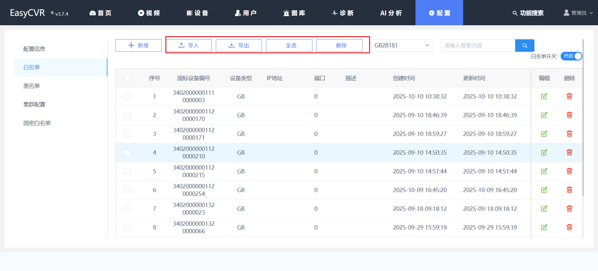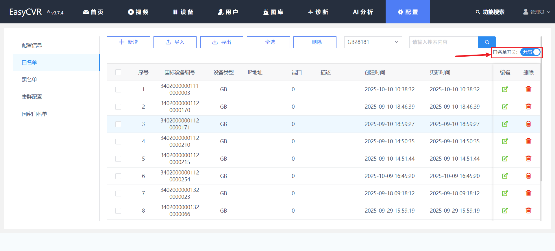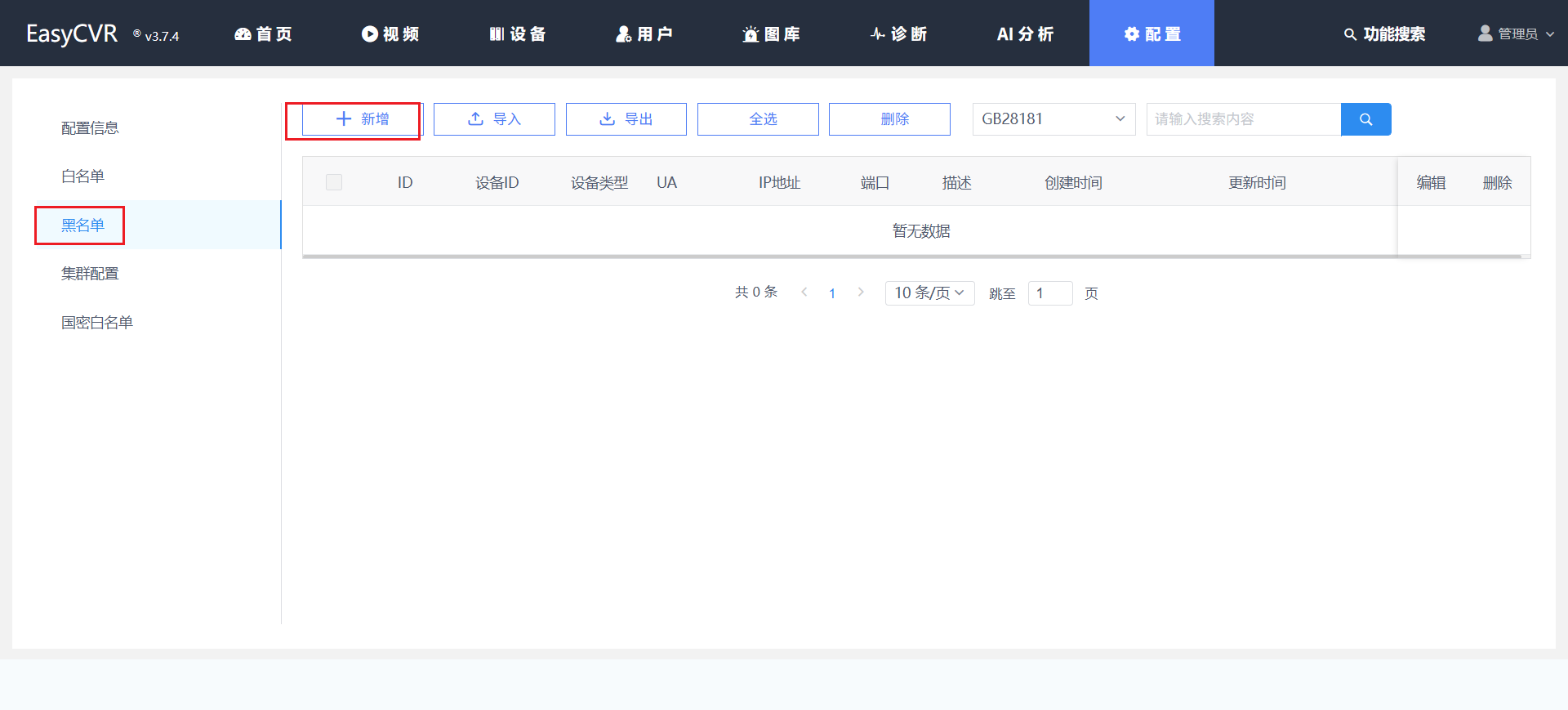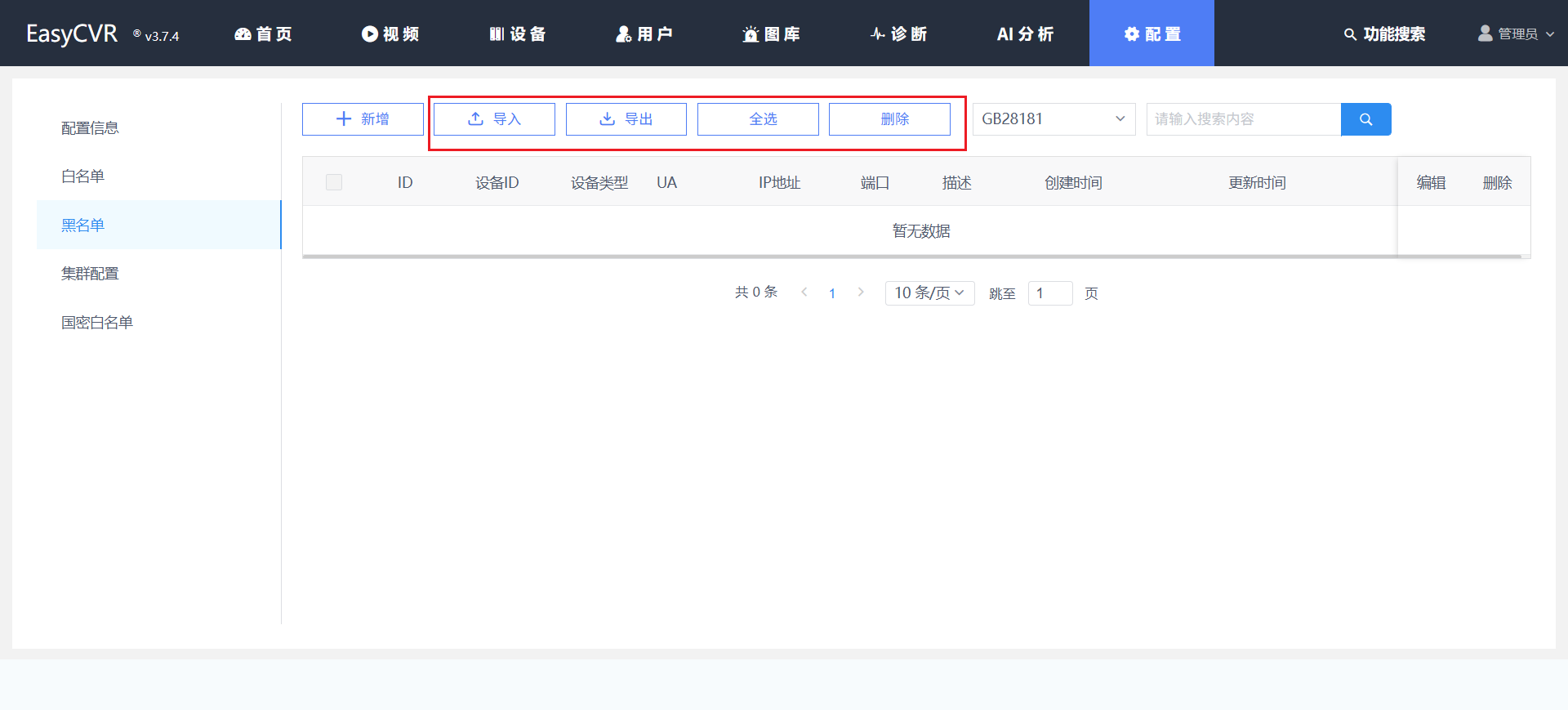 1)点击导航栏【设备】-【设备管理】,出现以下设备配置接入页面,点击【添加设备】(支持批量导入/导出设备):