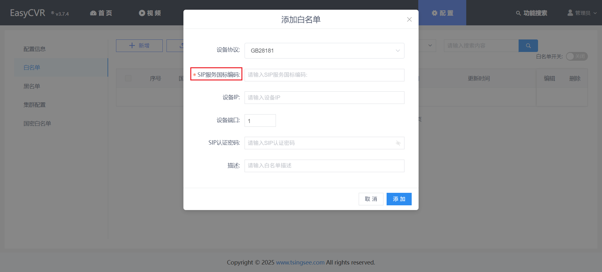 在这里配置完成上级国标平台的 SIP 信息后,勾选【启用】,然后点击【添加】,在级联管理页面能看到是否在线。