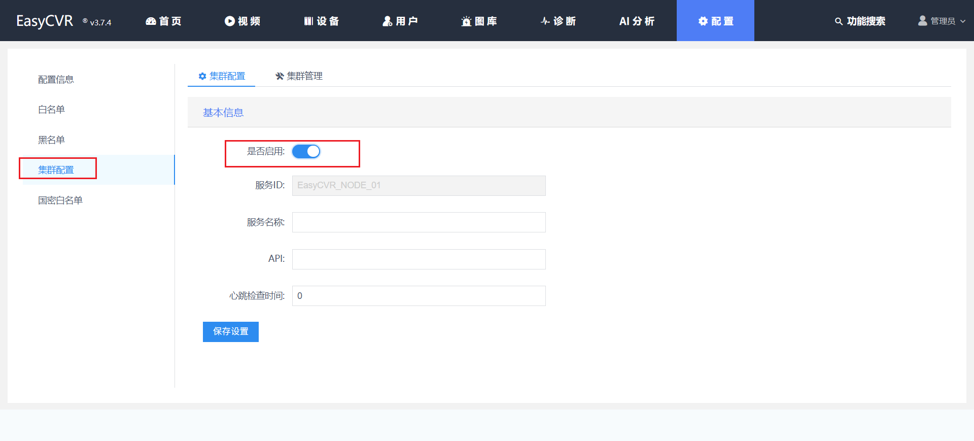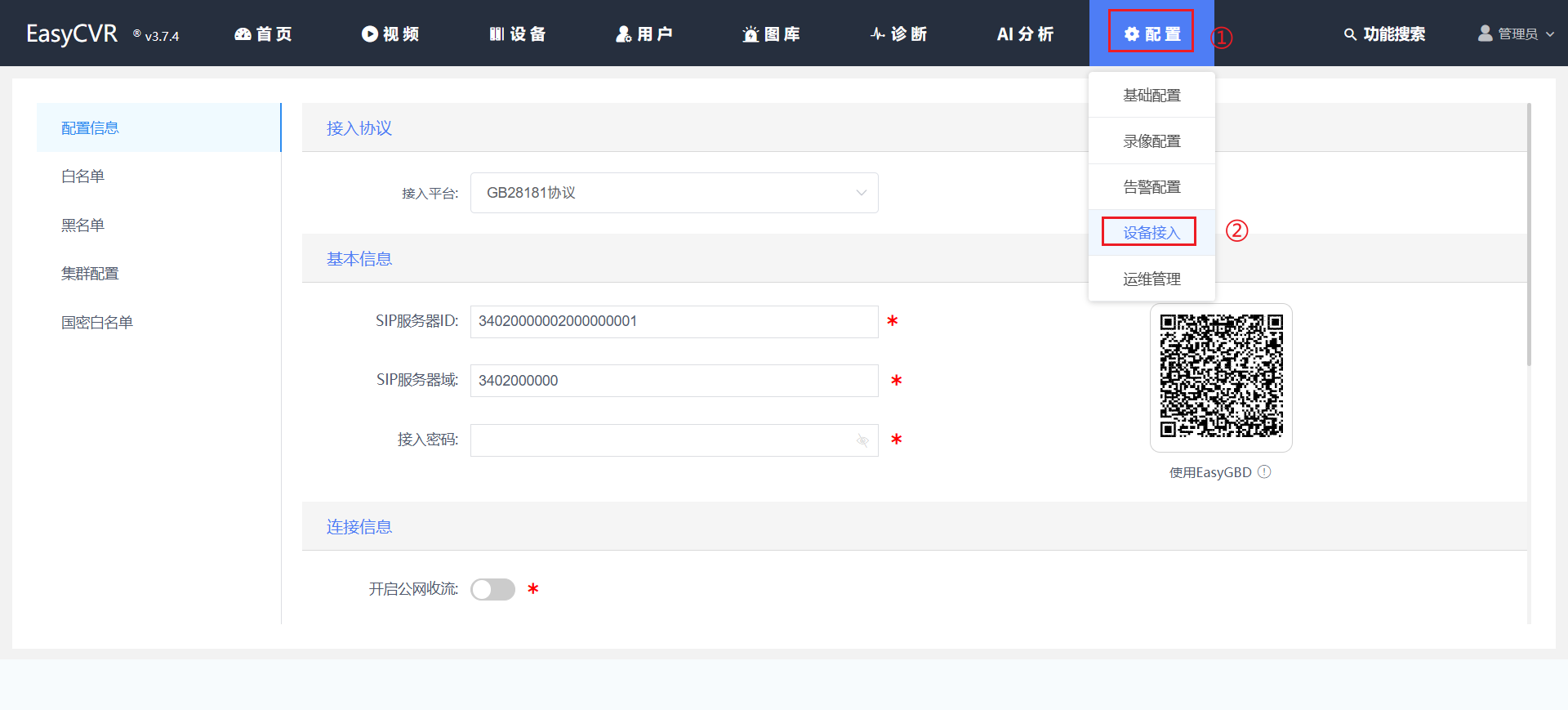 EasyCVR 可通过国标 GB 协议级联作为上级平台或下级平台,既可接受其它级联过来的国标平台作为下级平台,也可在【配置中心】-【基础配置】-【国标级联】通过添加上级国标平台 SIP 信息接入到其它上级国标平台。
