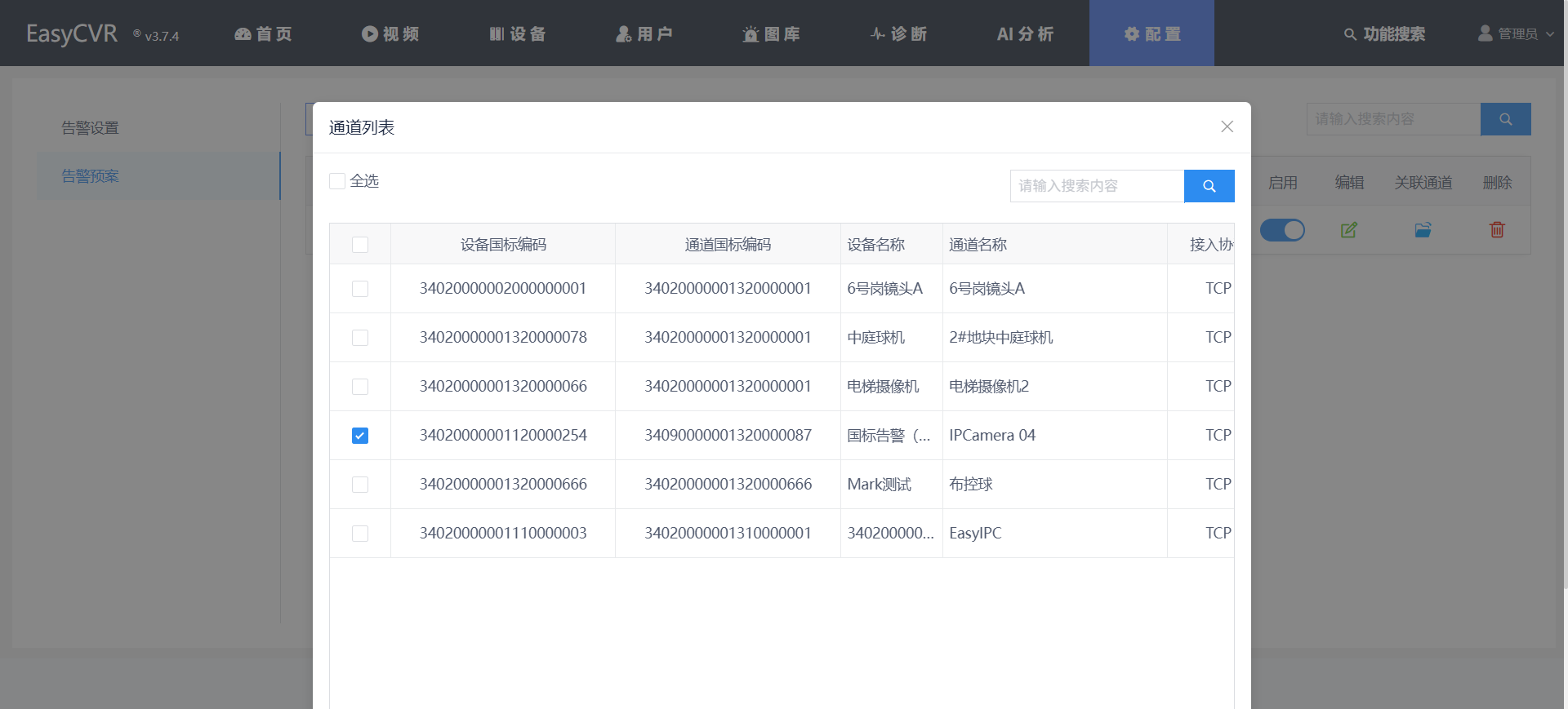 2)然后点击通道按钮,勾选需要级联上去的通道;支持手动更新设备。
