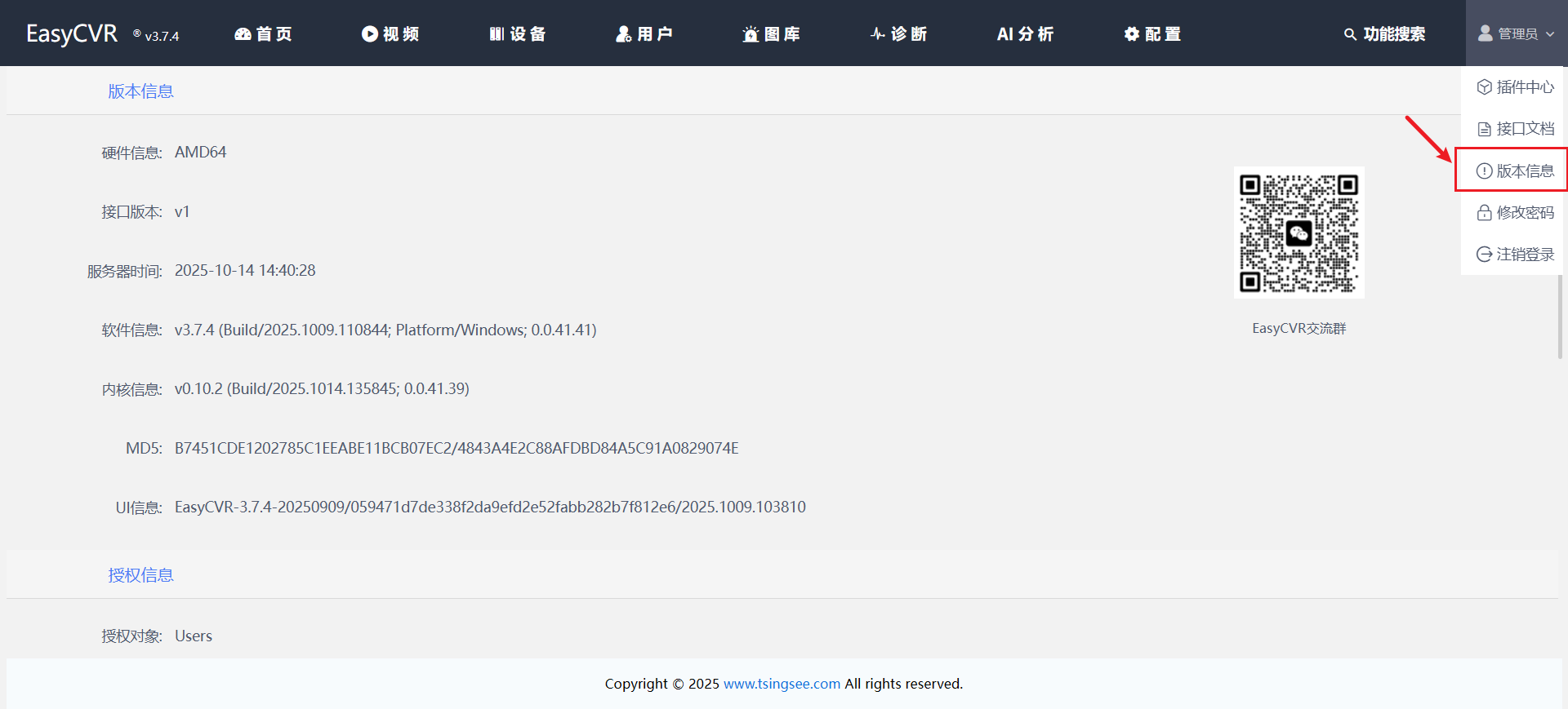 3)交流群设置:可配置微信交流群地址(将显示在版本信息页面中),设置为空则不显示交流群二维码;